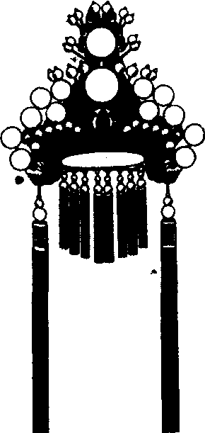 紫金冠zǐ jīn guān紫金为饰的帽子。紫金,紫磨金,上等金子:一面看宝玉头上带着累丝嵌玉~,额上勒着二龙抢珠金抹额,身上穿着秋香色立蟒白腋箭袖。(八·178) 古代名物 > 樂舞類 > 戲舞用物部 > 戲裝 > 紫金冠 紫金冠 zǐjīnguàn 亦稱“太子盔”。古代戲曲盔帽。緞製,頂有一小冠,上下均綴絨球與珠子,兩旁掛大絲穗兩根,盔後掛短穗一排,亦可加雉尾兩根。多爲銀色,亦有金色。爲戲曲中太子或年少將領所戴,如周瑜、吕布、李世民等脚色用之。 紫金冠zǐjīnguān❶束发冠的一种。士庶男子用以束发,军将武士则用作常服。元郑德辉《三战吕布》第三折:“紫金冠,分三叉,红抹额,茜红霞;绛袍似烈火,雾锁绣团花。”《封神演义》第八十一回:“紫金冠,名束发;飞凤额,雉尾插。”清宣鼎《夜雨秋灯录·续集》卷三:“其中有年轻者,面目端正,束发紫金冠,双雉尾,银锁甲,骑拳大鸡雏,指挥如意。”刘廷玑《帝京踏灯词》:“紫金冠插一枝翎,闹向长街杂翠軿。”《红楼梦》第三回:“及至进来一看,却是位青年公子:头上戴着束发嵌宝紫金冠,齐眉勒着二龙戏珠金抹额。”《粉妆楼》第三十七回:“不一时,中门内出来了一个:头戴点翠紫金冠,身穿大红绣花袍,腰系五色鸾带,脚登厚底乌靴,年约二旬,十分雄壮。” ❷又称“太子盔”。为传统戏曲中王子及年少将领人物所戴的帽子。主要由“多子头”和“大额子”两部分构成。冠顶耸立以珠花为饰的“多子头”,形似古之轻便小冠。前扇是“大额子”,以衔珠龙纹为饰。两侧龙耳尾子缀丝穗。脑后特缀女性才用的网络排穗,取其妩媚。多子头和网络排穗构成表示年轻英俊的艺术语汇(符号),故专用于太子。大太子用金色,二太子用银色,故又称“太子盔”。此冠亦用于年轻英俊的武将,但须在冠上插雕翎。如周瑜、吕布等,均戴插翎子的紫金冠,显得雄健英武。 紫金冠 紫金冠又称“太子盔”。为传统戏曲中王子及年少将领人物所戴的帽子。上有绒球和珠子多个,两边有龙纹垂耳,后有一排下垂短穗。戴用时也可加长雉尾(翎子)2根,如吕布、周瑜等所戴。 紫金冠