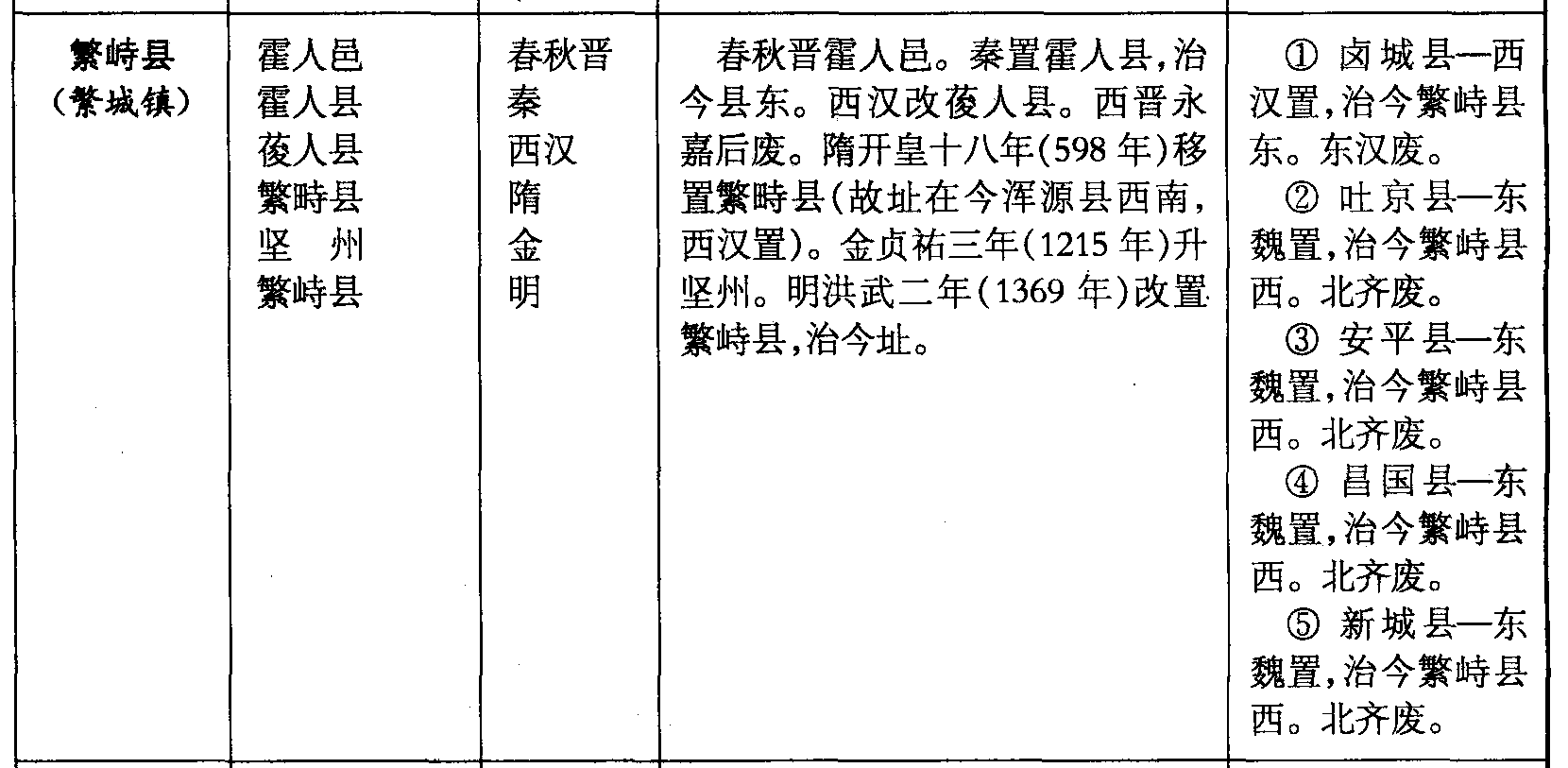 繁峙县(繁城镇)霍人邑霍人县葰人县繁畤县坚州繁峙县春秋晋秦西汉隋金明春秋晋霍人邑。秦置霍人县,治今县东。西汉改葰人县。西晋永嘉后废。隋开皇十八年(598年)移置繁畤县(故址在今浑源县西南,西汉置)。金贞祐三年(1215年)升坚州。明洪武二年(1369年)改置繁峙县,治今址。❶ 卤城县—西汉置,治今繁峙县东。东汉废。❷ 吐京县—东魏置,治今繁峙县西。北齐废。❸ 安平县—东魏置,治今繁峙县西。北齐废。❹ 昌国县—东魏置,治今繁峙县西。北齐废。❺ 新城县—东魏置,治今繁峙县西。北齐废。