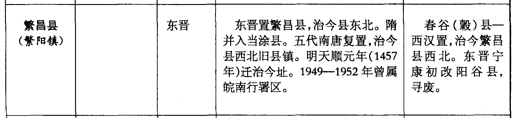 繁昌县(繁阳镇)东晋东晋置繁昌县,治今县东北。隋并入当涂县。五代南唐复置,治今县西北旧县镇。明天顺元年(1457年)迁治今址。1949—1952年曾属皖南行署区。春谷(穀)县—西汉置,治今繁昌县西北。东晋宁康初改阳谷县,寻废。