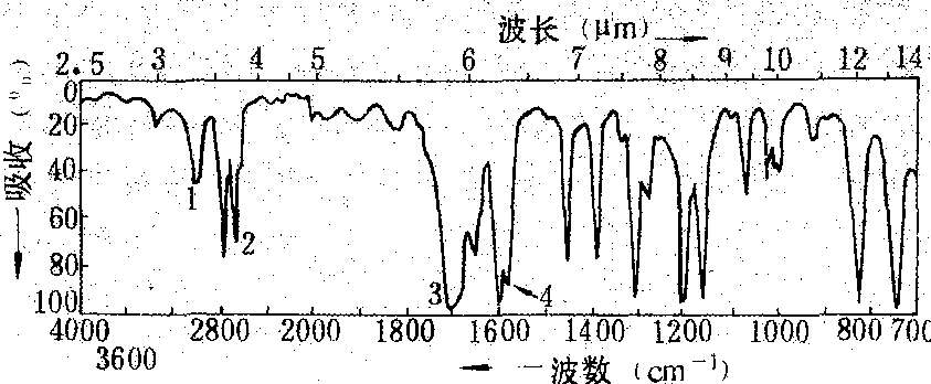 应用 可以利用红外光谱鉴别和测定农药、中间体原料分子骨架及各类官能团。复杂的有机农药分子中,存在着的多种原子和基团,被红外光激发后,都会产生各自的特征吸收。例如,烷烃的C—H键在2975~2845 cm-1(3.36 ~3.52微米)、醛酮羰基 在1740~1690 cm-1(5.75~5.92微米)范围内出现振动吸收。例如,农药中间体苯甲醛的红外光谱图(图2)中,就可见到: ❶芳烃的C—H的伸缩振动吸收峰;❷— —H伸缩振动吸收峰;❸ C=O和芳烃共轭的吸收峰; ❹芳烃和C=O共轭的吸收峰等。红外光谱图一般以波数(cm-1)或波长(微米)为横坐标,以化合物分子骨架或官能团对红外振动吸收百分率(%)为纵坐标作图。