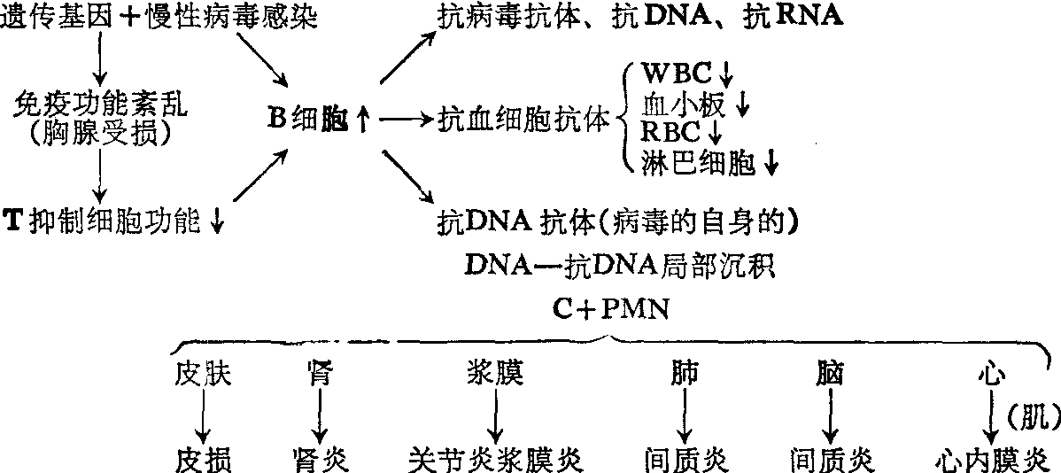 病毒感染使机体产生抗病毒抗体,同时破坏组织细胞或改变组织细胞的抗原性,从而使机体产生大量抗自身组织的抗体。循环中的抗原抗体复合物可以沉积于组织中及小血管壁,在补体的参与下,造成多器官的损害。另外,某些药物可能是通过直接改变组织的抗原性或作为半抗原与组织核蛋白抗原结合而诱发产生大量自身抗体。 症状 变化多端,分盘状和系统性两型,两型可以互相转变。 盘状红斑狼疮 常发生在面部,为局限性;偶尔亦见于头皮和手足背部,为播散性。初起为一片或数片鲜红色斑,黄豆大,上覆粘着性鳞屑,逐渐向外周扩大,呈圆形或不规则形,边缘清晰,略高于中心,有毛细血管扩张,鳞屑下有角质栓和扩大的毛孔,伴程度不等的瘙痒和烧灼感。新损害逐渐增多或多年不增加,疏散分布或融合成片。两侧面颊和鼻梁间的损害可连接成蝶形。粘膜上一般为灰白色小片糜烂,有时绕以紫色红晕。病程慢性,有时伴着色斑点,较四周低陷。头皮萎缩常更显著,头发脱落。在晒太阳或过度劳累后加剧,极少数可转变成系统型,或发展成鳞状细胞癌。 少数病例可有关节痛,发热,肢端动脉痉挛等现象,抗核因子阳性,偶尔找到狼疮细胞。少数播散性盘状损害为系统性。 系统性红斑狼疮 首先出现的症状可为皮疹、发热、疲乏、关节炎、肾炎、溶血性贫血、血小板减少性紫癜,心力衰竭、以后再陆续出现其他症状。 (1) 皮疹:约60~84%为多形性,以水肿性红斑为最常见。除发生于面部外、肩胛、上臂、四肢大小关节伸面、掌跖部、甲周、指(趾)端皆可发生红斑。颧颊部蝶形红斑、甲周或指尖红斑瘀点或盘状损害具有特征性。另一种为斑丘疹,局限或泛发,后者可误为药疹,有的为毛囊性损害。有时可见紫癜、水疱、血疱,破后形成糜烂、溃疡、结痂、疤痕形成、萎缩、角化和色素沉着。有时出现结节(约10%)发生在手指侧面,关节周围,臂,小腿和臀部,亦有为荨麻疹形性红斑,环形红斑、网状青斑,肢端红痛症,有时引起坏疽等。其他尚有弥漫性或在前额发缘部脱发,头发失去光泽,易折断脱落等。约20%病例累及唇和口腔粘膜、颊、软腭、齿龈、舌等,表现为伴有毛细管扩张的斑片或弥慢性潮红,其中可见点状出血,糜烂,偶有水疱、溃疡。 (2) 发热:占92%,各种热型俱可发生,长期低热较多见。 (3) 运动系统:约90%患者有关节痛。有时周围软组织肿胀,如风湿性关节炎,呈游走性、多发性,且可出现红肿热痛;或表现为慢性进行性多发性关节炎,且可发生畸形,与类风湿关节炎相似。亦可发生缺血性骨坏死,好发于髋、肩或膝关节,表现为疼痛,活动受累或关节僵直。 (4) 肾脏:占75%。对系统性红斑狼疮病例进行肾活检而确定有肾损害者占80~90%,其中有部分无临床表现。临床表现为肾炎或肾病综合征,尿内出现红、白细胞、蛋白质及管型。肾功能早期正常,后期可出现尿毒症。 (5) 心血管系统: 占65%。心包炎最多见,以干性为多,也可有积液。心肌炎也常见,可导致心力衰竭。疣状心内膜炎主要是壁层心内膜受损,症状可不明显。当炎症波及瓣膜时(常见的是二尖瓣),心前区可出现收缩期吹风样杂音,可诱发亚急性细菌性心内膜炎。50%病例有动脉炎和静脉炎,较常见的为锁骨下静脉的血栓性静脉炎,少数可出现冠状动脉炎。部分病例可有末梢血管病变如肢端动脉痉挛现象、血栓闭塞性脉管炎、游走性静脉炎等。 (6) 呼吸系统:可发生胸膜炎,多为干性,也可为湿性,有少量积液,也可发生狼疮性肺炎(慢性间质性肺炎)。胸部X线表现为片状浸润斑、条索状或网状阴影,多见于肺基底段,常持续多日,可导致肺不张,以至呼吸衰竭。肺动脉受侵犯(肺动脉炎)时可发生咯血、空洞,临终前常合并小叶性肺炎。 (7) 神经系统:在急性期或晚期发生,可出现各种精神障碍如躁动,幻觉、妄想、猜疑,强迫观念等。也可出现多种神经系统症状,表现为脑膜炎,脑炎、脑血管意外,脊髓炎、神经炎、蛛网膜下腔出血等,并出现相应症状如头痛、恶心、呕吐、颈项强直、惊厥、昏迷、偏瘫、截瘫等。 (8) 消化系统:40%患者有消化道症状,如食欲减退,吞咽困难,恶心,呕吐,腹痛,腹泻,腹水,便血等。 (9) 淋巴网状系统: 约半数病人有局部或全身淋巴结肿大,以颈腋部为多见,一般无压痛,质较软。病理检查显示慢性非特异性炎症。约1/3病例有肝肿大,1/10~1/5病例有脾肿大。 (10) 眼:约20~25%病人有眼底变化包括眼底出血,乳头水肿,视网膜渗出物,有细胞样体出现在眼底中心血管附近,呈圆形或卵圆形的白色棉毛样渗出,是继发于小血管闭塞引起的视网膜神经变性灶。其他有玻璃体内出血、结膜炎、巩膜炎等。 本病可和其他结缔组织病如皮肌炎、硬皮病、类风湿性关节炎等重叠或先后发生,还可以合并重症肌无力,口眼干燥和关节炎综合征,桥本甲状腺炎和天疱疮等。 实验室检查 血常规见红细胞计数降低,可发生溶血性贫血,偶可出现黄疸。白细胞数大都减少,少数可高达1~1.5万。血小板计数降低。血沉增快。20%病例直接或间接抗人球蛋白试验阳性。血清白蛋白降低,α2γ球蛋白增高,纤维蛋白原增高,球蛋白和冷凝蛋白均可增高。94.7%的病例血清IgG、81.6%IgA及57.8%IgM增高。血清类风湿因子约10~40%阳性。血清华康氏反应约10~20%阳性。抗凝血因子Ⅷ和ⅨⅪ的抗体阳性。 血查狼疮细胞约50~80%活动性患者阳性。抗核因子试验:约85~100%病例测定阳性,其滴度在1∶80