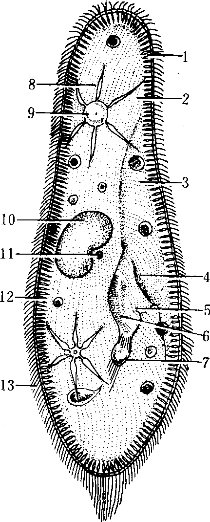 喇叭虫(Stentor)属旋唇亚纲(Spirotrichia),异毛目(Hetero-trichida),体呈喇叭状,故名。体表被有纤毛,后端细长呈柄状,可附着在其他物体上。前端有一喇叭状的口,口周缘 的纤毛常愈合成缘膜带。胞口在缘膜凹陷处的腹 面,下连胞咽。大核一 个,长念珠状: 小核若干个。体前左方,有一 个伸缩泡。生活在池沼中,常附着在其他物体上,如多态喇叭虫(S.polymorphus)钟虫(Vorticella) 属缘毛亚纲 (Peritrichia),缘毛目(Peritricha),体呈钟形,有一能伸缩的长柄,常以此暂时固着在他物上。口缘纤毛明显,大核一个,马蹄形; 小核多个,粒状。种类很多,单个生活或形成群体,常见的如迈氏钟虫(V.mayeri)。 肠袋虫(Balantidium) 属全毛亚纲(Holotrichia),毛口目(Trichostomatida)的寄生性纤毛虫。生活史有滋养体和包囊两阶段。滋养体大,呈卵圆形或梨形。通常在宿主肠内或在外界形成双膜构造的卵圆形或球形包囊。包囊被宿主误食后,虫体脱囊而出成为滋养体,进入大肠寄生,以吞食细菌,红细胞或其他细胞为食。如猪的结肠肠袋虫(B.coli)。此虫亦可寄生于人体。 内毛虫(Entodinium) 属旋唇亚纲(Spirotricha),少毛目(Oligotrichida)。虫体侧扁,卵圆形或长卵圆形。生活时,体前端有一明显的口缘纤毛带,除此之外体表概无纤毛。大核多呈棒状或香肠状,小核一个,球形,常位于大核腹侧中央。寄居在反刍动物牛、羊的瘤胃内,种类较多。如尾尖内毛虫(E.cauda-tum)。 纤毛虫与人类的关系 纤毛虫的种类很多,多数为自由生活,是浮游生物的组成部分; 钟虫、游仆虫(Euplotes),棘尾虫 (Stylonychia)等个体较大,均可作为鱼类等饵料,故在水系食物链中起着很重要的作用。此外,由于绝大多数纤毛虫以细菌、有机碎屑为食,而且在活性污泥中,纤毛虫的种类和数量之多远远超过鞭毛虫类和肉足虫类,所以纤毛虫在污水净化中有着积极作用。有些种类如结肠肠袋虫,对人畜亦有一定危害; 多子小瓜虫 (Ichthyophthirius multifi-liis)、鲤斜管虫(Chilodonella cyprini),虱性车轮虫(Trichodina pediculus)都寄生在鱼的鳃或皮肤上,可引起鱼类大量死亡。 纤毛纲Ciliata原生动物门的一纲。虫体外密被纤细的短毛,以纤毛为运动胞器。体结构复杂。核有大核、小核之分。无性生殖为横分裂;有性生殖为接合生殖。种类较多。海洋、淡水都产,如草履虫、钟虫、喇叭虫等;部分寄生,如肠袋虫。 纤毛纲 纤毛纲xianmaogangCiliata无脊椎动物,原生动物门的1个纲,为本门动物中形态最复杂、分化最高级的类群。体形一般固定,全身密被纤毛。细胞核有大核和小核两种,形状和功能有所不同。大核仅有1个,呈肾形、球形、椭球形、马蹄形等,与营养有关,在有性生殖时可融解;小核有1个(尾草履虫),2个(双小核草履虫)或多个(多核草履虫),多呈球形,与生殖有关。除无性生殖的横二分裂外,还可进行有性生殖,即2个虫体暂时靠拢,交换一部分核质的接合生殖。种类较多,分布在淡水和海水中(如草履虫、钟虫、喇叭虫),部分寄生于人体大肠中引起痢疾的结肠肠袋虫(Balantidi-um coli)。此外,还有些种类寄生在反刍动物的反刍胃中如等毛虫(Isoticha)和内毛虫(Entodinium)等,与宿主形成共生关系。 ☚ 疟原虫 草履虫 ☛ |