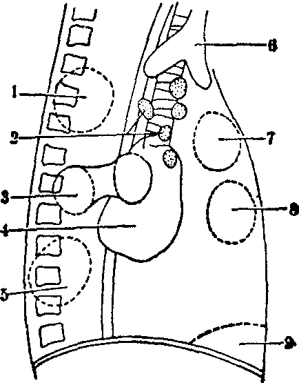 图1 纵隔的划分,位置示意图 伤等。纵隔组织成分的发育畸变可产生多种先天性病变。如在胚胎发育过程中,胸腺、甲状腺、甲状旁腺关系密切,在从原始咽部向下移至颈部和纵隔不同部位的过程中,可有成熟腺体的位置异常; 偶有一种腺体误入别种腺体,成为纵隔肿瘤或囊肿。在大系列的统计资料中,纵隔新生物良性者占75%;而儿童中恶性病变占40.5~50%。成人纵隔肿瘤发病率以胸腺肿瘤和神经原性肿瘤最高,各约占20%,其余依次为心包、支气管、肠原性囊肿、恶性淋巴瘤、胚细胞原性肿瘤等。儿童纵隔肿瘤的发病顺序以神经原性最高,占38%,余为淋巴瘤、胚细胞原性肿瘤等。 纵隔淋巴结肿大,以结核病、组织胞浆菌病或结节病为常见。其中结核病目前仍占首要地位。肿大淋巴结以肺门或右气管旁多于隆凸下组。淋巴结压迫支气管造成阻塞时出现远端支气管的阻塞性肺炎,甚至化脓和支气管扩张。淋巴结干酪样坏死灶可逐渐出现钙盐沉着。 纵隔肿瘤和囊肿一般无症状。肿瘤增大或恶变可引起症状。全身性症状有乏力、体重减轻、食欲减退等。肿瘤压迫或侵蚀邻近组织或气管-支气管引起刺激性咳嗽,活动后气急、喘鸣,反复呼吸道感染,重者呼吸困难和窒息;压迫食管引起食管移位,吞咽困难。压迫左侧喉返神经出现声音嘶哑和失音; 压迫上腔静脉出现上腔静脉压迫综合征;或因淋巴结转移而引起颈交感神经综合征;恶性肿瘤侵蚀或囊性肿瘤破溃到心包可引起心包炎、心包填塞症,