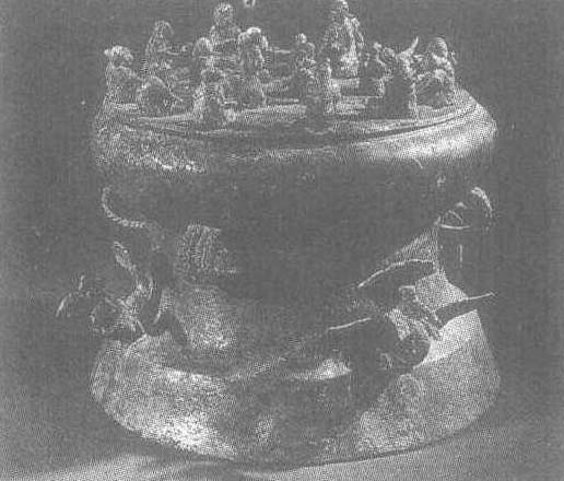 西汉。滇族统治者贮存贝币的用具。高21厘米,云南省晋宁石寨山出土。北京中国历史博物馆藏。铜鼓形,有四耳,胴部和下部有线刻、圆雕孔雀各四只。器盖上铸女俑18人,滇族形像的有7—8人,余为不同部族的女子。内容反映的是家庭手工业从事纺织劳动的场面。体形较大而通体鎏金坐于矮塌之上的女子,是群俑之中的滇族奴隶主,其后有滇族和别族侍女,她正监督着其他奴隶从事劳动,这些女奴多为别族妇女,她们或撚线,或足踏腰机,有的织布有的捧杼,各行其事。西汉时期,滇国的奴隶制已很发达,奴隶是当时社会的主要劳动力,买卖奴隶,通过战争劫掠奴隶的现象是很普遍的。男人主要从事畜牧,狩猎和战争,家庭手工业,农业生产则由女人完成。此件贮贝器为我们了解当时社会分工的情况提供了很好的实物例证。