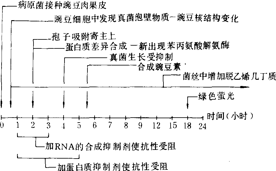 根据豌豆与茄镰胞菜豆专化型不亲和互作反应的时序分析,虽然病菌小型分生孢子接种内果皮表皮细胞后形成牢固的吸附关系需要2小时,但寄主和病菌之间的信号传递早就发生。在15~30分钟内豌豆内果皮表皮细胞中即出现真菌细胞壁的组分和含有脱乙烯几丁质化合物。到20分钟尿嘧核苷加速参入RNA,在前3个小时中,RNA的合成对随后抗病性的表达有关键作用,2小时时对PAL酶有特殊活性的mRNA增加6倍。5小时内PAl酶和其他一些病程相关蛋白相继出现。5.5小时首次检测到豌豆素,并在受抑制的菌丝顶端和植物细胞中出现氨基己糖。真菌生长从4小时开始到6小时被完全抑制。12小时真菌菌丝中的脱乙烯几丁质增加。18小时在植物细胞中邻近真菌孢子的地方开始有黄绿色萤光色素积累(图2)。 协调性 一些植物病理学家认为,植物抗病性是植物细胞中复杂机制协调作用的结果,可以看成是与多种因子有关的函数关系。植物对侵染维管束的病原菌会产生一系列防卫反应,如凝胶、侵填体、植物保卫素、单宁、形成新导管以及导管末端对真菌孢子的捕获作用等。但它们在病程中的充分效应不仅要有一定的发生时序,而且也表现在协同作用方面。凝胶和侵填体的产生有助于植物保卫素和单宁的积累,而植物保卫素和单宁则具有保护凝胶和侵填体不受病原物破坏的作用。在植物保卫素合成中,植物细胞是临时合成并即时向适当靶点输送以保证反应细胞本身不受毒害。另外,植物对病菌侵染的防卫反应还与其他胁迫反应相协调,如富含羟脯氨酸的糖蛋白可以由不同胁迫因素诱导,但在不同情况下被转录的基因显然不同,这表明富含羟脯氨酸的糖蛋白是由很多基因控制的,在不同胁迫环境中可选择性活化。这样,同一套反应装置由于信号传递系统不同就可以在不同胁迫反应中起作用。这是植物在进化过程中发展起来的细胞反应体系的高度节约性和协调性。 |