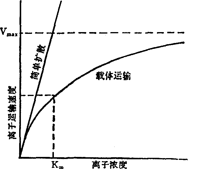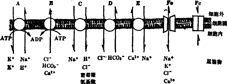 图1 细胞膜通透性示意图 水的通透 水分子能通过质膜的类脂双层出入细胞,从而调节细胞的体积和胞内渗透强度。当动物细胞置于高渗或低渗溶液中时,引起渗透压的变化。在低渗溶液中,水从胞外向胞内迁移,使细胞膨胀,最终细胞可能被解体;而在高渗溶液中,由于水从胞内向胞外迁移,以致细胞收缩。许多动物细胞,在环境剧变的情况下,能使用其他离子运输系统,调控胞内渗透强度,维持细胞的体积。例如在高渗情况下,细胞膜上的Na+—H+反向运输器和Cl--HCO3-交换器被激活,它们分别把胞内由H2O和CO2在碳酸酐酶作用下产生的H+和HCO3-与胞外的Na+和Cl-交换。这样,使胞内盐浓度和渗透强度增加,引起水的内流,恢复细胞体积。因此,水通透细胞膜的过程,往往伴随着膜上其他一些离子或溶质运输系统的作用。 细胞膜的运输系统主要包括以下类型: A和B分别为二磷酸腺苷酸驱动的双向泵和单向泵;C表示依赖于Na+的共同运输器; D为阴离子交换器; E是离子偶联运输器;F为离子通道,F。与F。分别表示通道的开放与关闭(图2)。概括起来,以上的类型可以归为两大类: 一类是载体运输系统(图2,A—E),另一类是选择性离子通道(图2,F)。两者在动力学上有显著不同(图3),当所有载体蛋白的结合位点被运输物占领时,运输速度达最大值(Vmax),而且,每一种载体蛋白对它的运输物质具有特有的结合常数(KM),所有载体运输速度与运输物浓度间符合米凯利斯-门顿动力学原理。通道运输则属于简单扩散动力学特性。