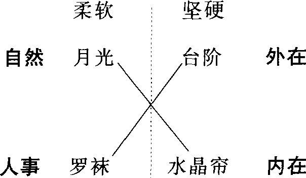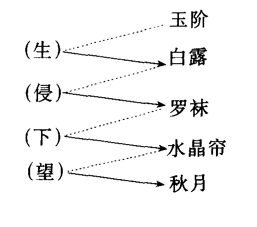 “秋月”给每个意象以充分的光亮,即给它们以充分的意义。月光照射在空荡荡的“玉阶”上,加重了诗中令人伤感的气氛;而那种往复循环、无休无止的运动,也只能强化主人公内心里驱之复来的烦乱思绪。程氏还认为,这一线性发展中的纵聚合组织,还可在意象层次上证明雅可布森所谓的从选择轴向组合轴上的投射。诗人巧妙而精细地使语言功能扩而大之,空间层面于是被引入了时间秩序。这些彼此对立的意象,仿佛“自然而然地”生发出了诗意: