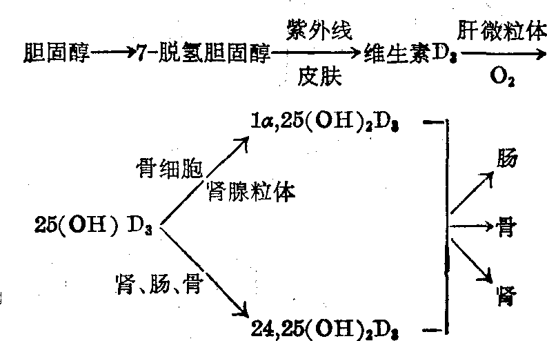 麦角钙化醇也以同样途径在肝和肾中羟化产生1,25-和24,25-二羟衍生物。维生素D的这两种代谢物对骨的作用是通过对不同的细胞的影响实现的,如1α,25 (OH)2D3作用于破骨细胞,促进钙自骨中逸出,而24,25—(OH)2D3则作用于软骨细胞或成骨细胞,使钙沉着于骨中,在甲状旁腺激素作用下,这两种维生素D的代谢物在骨中共同作用调节血钙水平。 最近在大鼠的垂体腺中发现有对1α,25 (OH)2D3专一的胞浆受体。因此维生素D2及其代谢物在神经生理生化方面的作用将为研究者所注意。 维生素D缺乏能使儿童发生佝偻病,成人则患骨质软化症。一些功能型的内分泌疾病会影响维生素D代谢导致维生素D缺乏。 抗惊厥剂对维生素D的代谢有影响,缓泻剂与泻药以及降血脂药都影响脂溶性维生素缺乏。 维生素D的中毒剂量尚无定论,但如果每天摄入在15万至50万IU,一至三个月即可引起中毒。婴儿如每日摄入量在4万IU以上,则应密切注意。 中毒的早期症状是突然食欲不振、恶心、呕吐、极度口渴和多尿;便秘和腹泻交替发生。以后逐渐消瘦、易怒、抑郁,并渐进入昏迷状态。尸体解剖可见动脉、肾小管、心脏、肺的钙化现象。 中毒病人血清钙有时升高,血清磷及碱性磷酸酶无规律性变化;红细胞沉降速度增加;X片可见骨生长点密度增高,而其他部分又可能出现钙化不良现象。 维生素D代谢物,如25-(OH)D3、1α,25 (OH)2D3和1α—(OH)D3已合成,并用于临床。 接受药物治疗的癫痫病人需要供给大剂量维生素D,50~250μg/d。有肝病的病人,D3羟化速率降低,可给予25—(OH)D3。胃肠道不健全的病人常给100~300μg/d维生素D。慢性肾病会使1α,25 (OH)2D3的生成量减少,给肾性骨营养不良病人以1α,25 (OH)2D3或1α—(OH)D3可得较好的效果。维生素D代谢紊乱疾病,如低磷酸盐佝偻病,过去用补充磷酸盐治疗,加或不加维生素D,现以大剂量(6μg/d)1α—(OH)D3或1,25(OH)2D3代替维生素D可使血浆生化异常现象很快消失。 双氢速变固醇(dihydrotachysterol,DHT3) 是维生素D的衍生物,已于临床应用。在肝细胞内被羟化成25羟基二氢速变固醇,其结构与维生素D活性代谢产物1,25二羟基钙化固醇相似,故不需在肾脏羟化即可发挥生物活性。其促进钙吸收、骨生长作用比维生素D弱,抗佝偻病活性也比维生素D弱。其促进骨溶解、肾排磷、血钙升高作用比维生素D强,比甲状旁腺弱。临床用于甲状旁腺功能不足。可口服。长期连续应用效力不减,一般先每日口服油剂1~3ml(每毫升含0.25mg),以后每日或隔数日用1ml维持。
