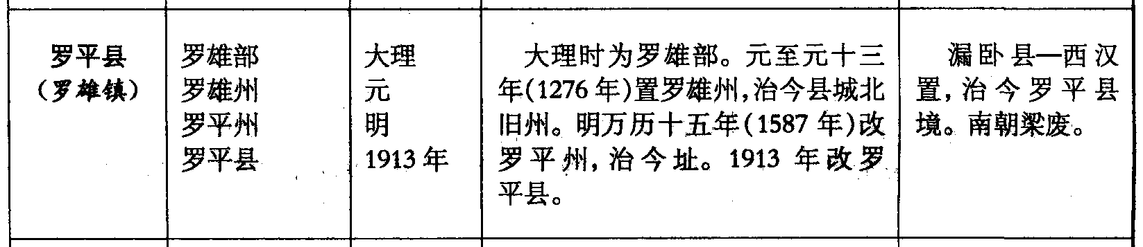 罗平县(罗雄镇)罗雄部罗雄州罗平州罗平县大理元明1913年大理时为罗雄部。元至元十三年(1276年)置罗雄州,治今县城北旧州。明万历十五年(1587年)改罗平州,治今址。1913年改罗平县。漏卧县—西汉置,治今罗平县境。南朝梁废。