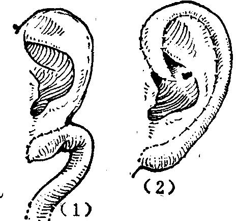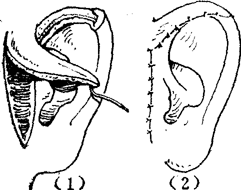 图1 耳轮推进缝合法修复耳轮缺损 局部皮瓣法也常用于耳廓缺损的修复。如耳前局部皮瓣可用于耳轮脚部的修复(图2),耳后乳突部的局部皮瓣结合软骨移植支架,常用于耳轮和耳廓部分缺损的修复(图3)。还可将皮瓣自相折合用以修复耳垂(图4)。
