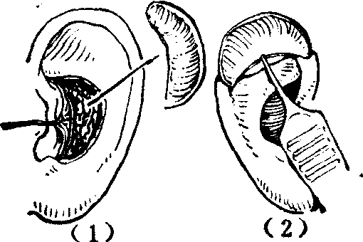 图6 耳轮全缺损用细长皮管修复 软骨移植用以构成修复缺损的支架。如所需面积不甚大时,可自同侧或对侧耳甲切取(图7)。切取后耳甲不致变形。如需用软骨很多且需雕刻造型时,则须自肋软骨取材。
