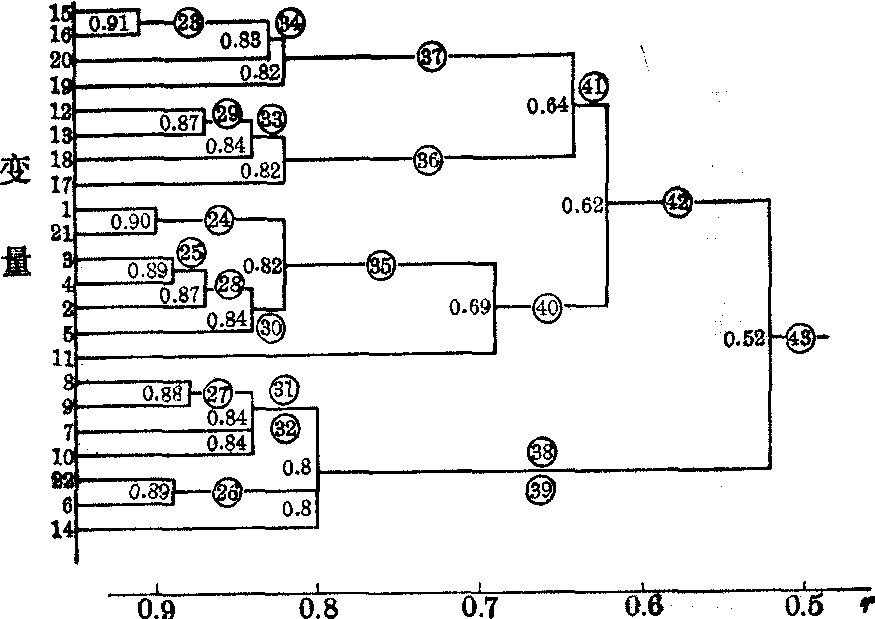 (3)对变量进行聚类。首先将22个变量看成22类。这时任两类间的相关系数就是任两变量间的相关系数,如表3所示。其次,从表3中挑出一个最大的相关系数0.91,将相应的第15、16两类合并成一类,记作第23类,这样就把原来的22类合并成为21类。再计算其余各类与新类(第23类)的相关系数。制出21类两两间的相关系数表(类似表3,从略),从表中又挑出最大的相关系数0.90,并将相应的第1、21两类再合并成一类,记作第24类,这样就把资料合并成20类。再计算新类(第24类)与其余各类的相关系数,列出20类两两间的相关系数表(类似表3,从略),从表中挑出最大的相关系数0.89,并将相应的第3、4两类再合并成一类。如此一直下去,直至合并成只有一类为止。整个聚类过程及结果可用图表示。