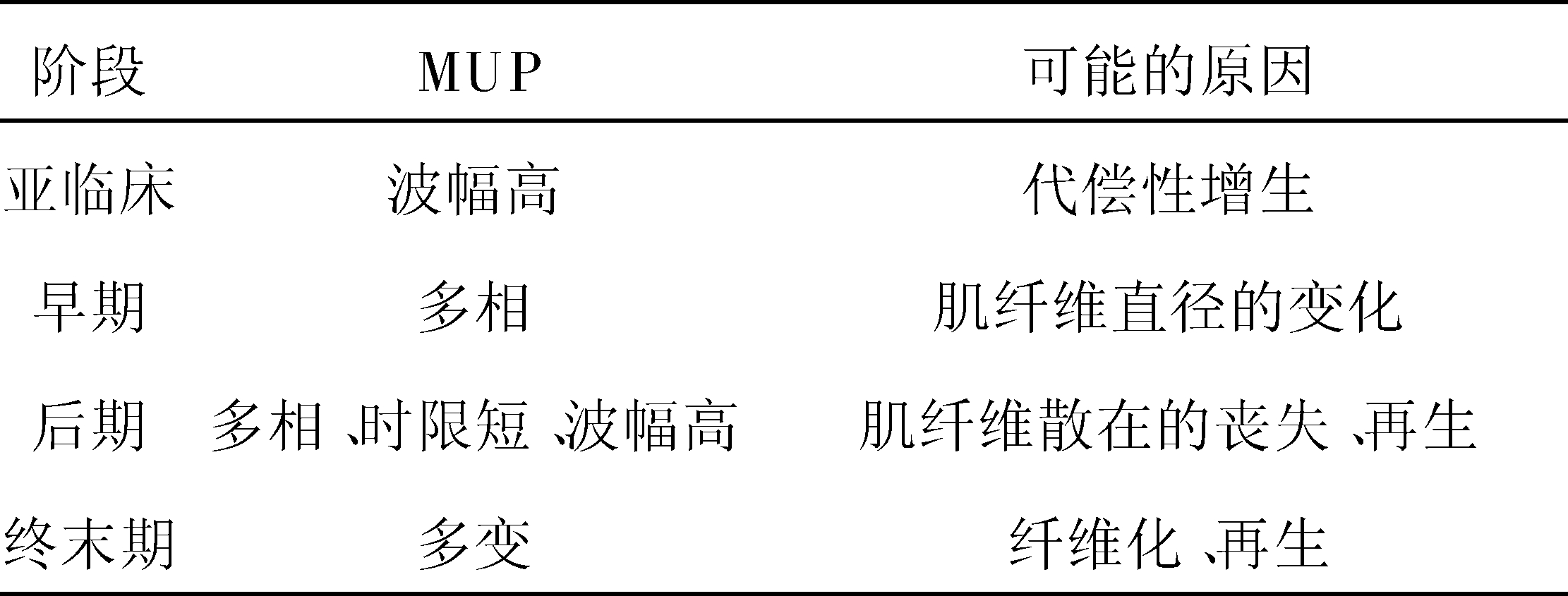 Buchthal将肌病的肌电图诊断标准总结为表1,在诊断肌源性损害时,至少应具备特异性诊断标准中的两条才能确定。Stalberg认为肌营养不良不同阶段的肌电图变化如表2。
