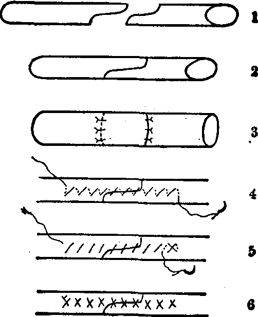 腱两断端相对地斜切0.5~0.75cm(图1,2)然后用7-0显微缝线在断端间断缝合三针(图3),再在两侧各缝两次纵行的连续缝合(图4,5,6)。进针仅缝表面小束纤维,不通过腱中心。如此不会绞窄肌腱断肌腱显微缝合法端的血循环,肌腱可以自行愈合。这种缝合法还可以使缝合口即时获得一定抗张力。术后只需制动腕部3周,而让手指早期作主动屈伸练习 (但不能作抗阻力的伸屈手指动作)。