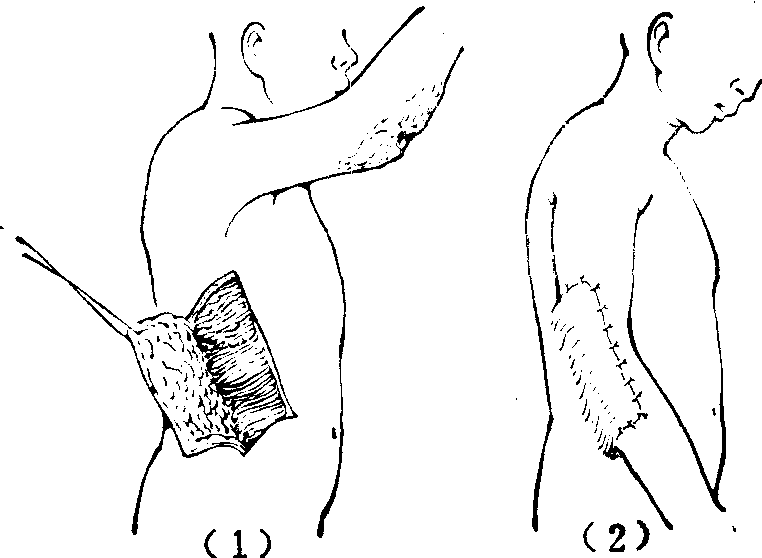 图1 肘屈侧瘢痕挛缩用连串Z成形术附加皮片移植术治疗 肘伸侧瘢痕挛缩,可在肘后鹰嘴部的上下方各作一横切口,直至深筋膜层,分别向上方和下方作广泛充分的剥离进行松解,必要时还可切开深筋膜,或将三头肌腱膜切开,以助肘关节屈曲复位。鹰嘴上下的创面均以中厚皮片修复。如肘伸侧的瘢痕挛缩系由深度烧伤所致,引起关节粘连僵直,需行涉及肘关节内的手术时,则应以皮瓣修复,如胸侧壁的皮瓣(图2),或预先制备皮管以供修复之需。