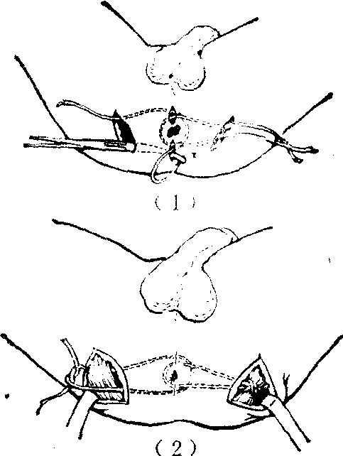 (2) 阔筋膜条移植肛门环缩术: 括约肌损伤严重无法行缝合修复术或丧失神经支配时采用之。操作方法,为在两侧坐骨结节和肛门前后部位各作切口,各切口间经皮下剥离后以环形隧道相通。取阔筋膜两条,先将一条从一侧坐骨结节部的切口穿入,经皮下隧道绕过肛门后,再由该切口引出,呈半环形。将筋膜条的一端穿经臀大肌深部的一股肌纤维后,和另一端收紧打结并缝合固定。另一条筋膜同法操作植入对侧。两条筋膜组成环形使肛门紧缩(图1),松紧以恰能通过示指指尖为适度。