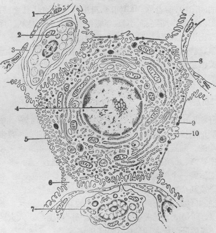 图5 肝细胞、肝血窦和胆小管超微结构模式图 1.内皮细胞 2.贮脂细胞 3.网状纤维 4.肝细胞核5.细胞间通道 6.细胞间陷窝 7.肝巨噬细胞 8.窦周间隙 9.细胞连接 10.胆小管