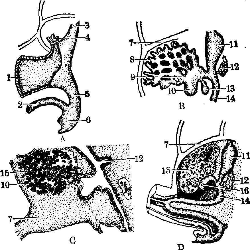肝的发生 A.第4周人胚 B.第5周 C.第5周肝脏的矢状切面 D.第6周人胚矢状剖面 1.卵黄囊蒂 2.尿囊 3.前肠 4.肝突 5.后肠 6.泄殖腔 7.原始横膈 8.肝管分支 9.肝管 10.胆囊始基 11.胃 12.背胰始基 13.复胰始基 14.十二指肠 15.肝 肝内胆管系统是肝细胞索重复分支逐渐形成的,每一小支的末端可分生出呈放射状排列的胆小管,其末端的上皮性细管称为Herring管。由一条肝细管分生出来的肝细管分支,本身形成了一个分泌小叶。其细管向肝小叶之间的小管吻合,形成小叶间胆管,后者继续向肝门方向生长,与肝门处的肝管吻合连接。小叶间胆管的生长是沿门静脉分支(小叶间静脉)进行的,二者伴行于肝小叶之间,同时又有肝动脉的分支(小叶间动脉)出现,三者共同组成肝门管区。肝因血液供应充足,生长迅速。初期左、右二叶相等,第6周时,右叶生长较快,分生出方叶、尾叶和中叶,并开始造血活动而呈红色。第3月初期肝明显增大,占据腹腔大部。 ☚ 消化管畸形 胆囊与胆囊管的发生 ☛ |