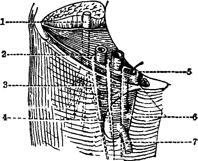 图1 股三角 股三角区浅筋膜较厚,内有腹股沟浅淋巴结呈“T”形排列于腹股沟韧带下方及大隐静脉末端周围,它收纳会阴、腹壁、臀部及下肢的淋巴。大隐静脉末端的属支和股动脉发出的皮支,以及股神经的皮支都分布于此区。大隐静脉末端的属支有阴部外静脉、腹壁浅静脉和股内、外侧静脉。大隐静脉曲张进行高位结扎时,需将这些属支一一切断结扎,否则造成静脉血逆流,导致手术失败。在取腹股沟皮瓣时,常保留股动脉的腹壁浅动脉和旋髂浅动脉以及伴行的同名静脉,以备血管吻合。此外,生殖股神经和股外侧皮神经也出现于此区; 前者经腹股沟韧带中点下方布于股前上分皮肤与阴囊; 后者在髂前上棘以下约5cm处,穿大腿深筋膜至浅筋膜,布于股外侧面皮肤。