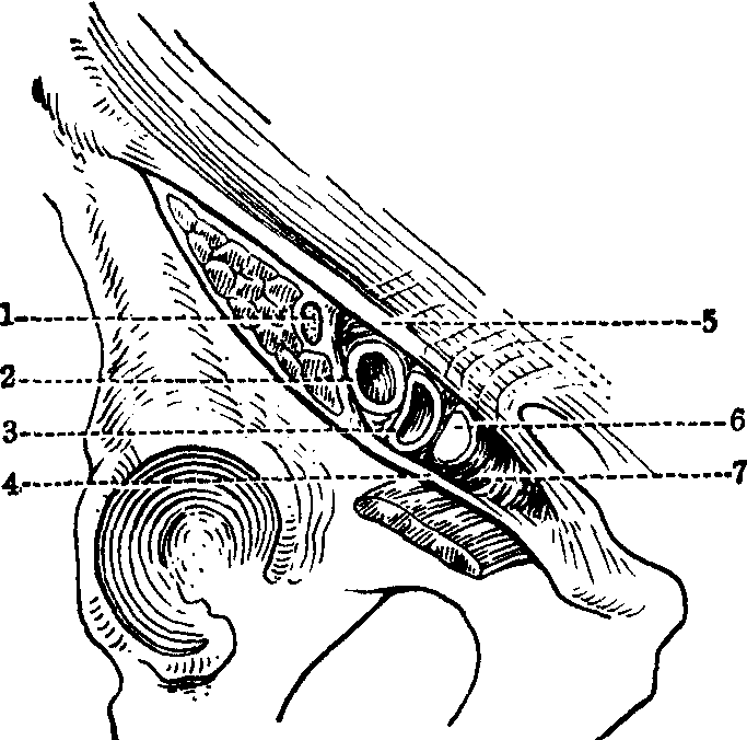 图2 股鞘示意图 股三角前壁的阔筋膜,在距耻骨结节下外方约4cm处有一缺口,称为隐静脉裂孔。它被筛筋膜封闭。筛筋膜被股部的浅血管,大隐静脉及淋巴管穿过。在股三角底,由外侧向内侧排列的重要内容是:股神经、股动脉、股静脉和淋巴结以及股管等,但在股三角尖处,股动脉位于股静脉前方。股动脉主要分支为股深动脉。股深动脉发有旋股内,外侧动脉等。旋股内、外侧动脉与股深动脉第1穿支和臀下动脉在股后部形成十字吻合。股鞘位于股三角上分,由腹横筋膜及髂腰筋膜伸延形成。其中包含股动脉、股静脉及股管。股鞘上宽下窄,呈漏斗形,长约3~4cm。借两个纵隔将鞘腔分为外、中、内三格: 外侧格容纳股动脉,中间格容纳股静脉,内侧格为股管。股管内有1~2个淋巴结,称为腹股沟深淋巴结(Cloquet结)。鞘的下端与血管外膜融合。 股三角向上经腹股沟韧带深面的血管腔隙和肌腔隙与腹膜外组织相通。股管长约为1.5cm,上端是股管入口,称为股环,内侧壁向下外倾斜,与股静脉外膜融合,所以管的下端是封闭的。股环的前界为腹股沟韧带,后界为耻骨梳韧带,内侧界为腔隙韧带游离缘,外侧为股静脉。股环直径为 0.8~1cm(图3),仅能容纳小指尖。股环由腹膜外脂肪填塞,遮蔽股环的腹膜呈一小窝,称为股小凹。倘腹腔内容经股管突出,称为股疝,在女性较男性