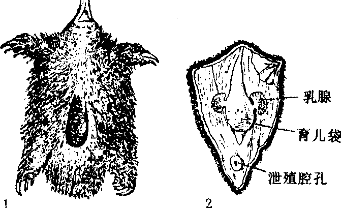少数低等哺乳动物,如大袋鼠和针鼹等,在雌体腹部有1个由皮肤皱褶形成的袋,袋内有乳腺和乳头,未充分发育的幼兽即在其中哺乳,故称育儿袋。袋鼠的育儿袋有1对袋骨支持腹壁;针鼹的育儿袋是临时性的,只有在生殖期才形成,母兽可将卵移至育儿袋中孵化,一般在哺乳期过后,针鼹的育儿袋便消失。