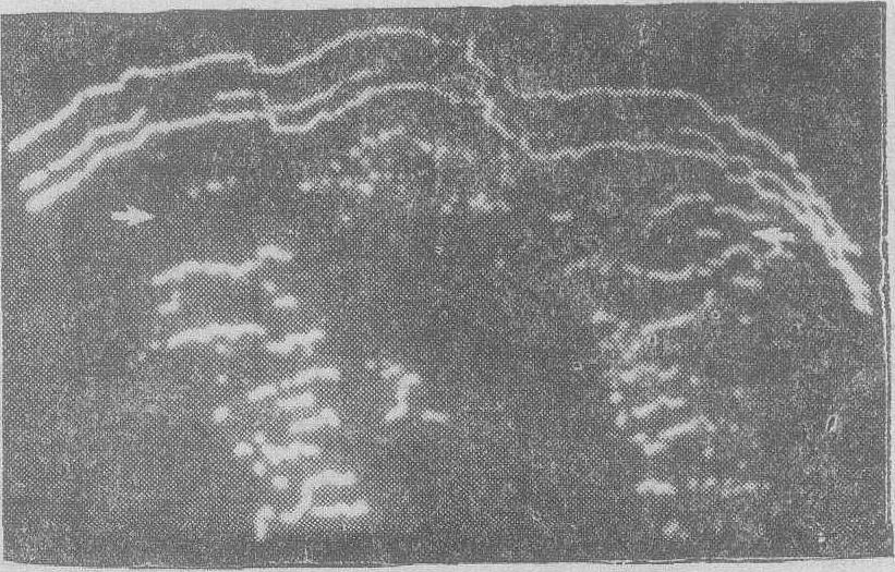 图1 左眼成视网膜细胞瘤的声象图左侧箭头示右正常眼及晶状体,右侧箭头示左成视网膜细胞瘤,肿瘤位于颞侧 甲状腺肿瘤 用直接探测或间接的间隔连续显象法,在灰阶超声图上出现甲状腺弥漫肿大或局限性肿大,前者常属于结节性甲状腺肿或甲状腺炎,后者则多为肿瘤。应用超声探测能鉴别肿瘤属于囊肿性、实体性或混合性。甲状腺囊肿呈现一个边缘清楚的透声暗区; 甲状腺炎伴有水肿时,呈均匀性肿大,轮廓清楚;实体性肿瘤,如呈现均匀性细小回声,多属良性,如呈现强烈不规则反射或肿瘤后壁模糊不清时,则提示有恶性可能。结合放射性核素扫描能提高诊断的准确性。通过连续切面象,可测定其体积。 乳腺肿瘤 应用5兆赫频率以上超声灰阶显象仪能显示乳腺囊性增生病、囊肿、纤维腺瘤、乳腺癌等的不同图象。乳腺囊肿的边缘清晰,中间为透声暗区;纤维腺瘤的边缘光滑,后壁清晰,多为均匀细小反射,或为实性暗区;乳腺癌则呈现强烈的不规则回声,边缘不整齐,底部回声减弱或有缺损。因而应用超声鉴别乳腺囊肿与实体瘤有较大价值,但在鉴别良恶性方面还不够满意。 肺及纵隔肿瘤 虽然由于肺泡内含有空气,超声难以穿透,因而超声对肺部肿瘤的诊断价值不大。只有当肿瘤靠近胸壁,在肿瘤与胸壁间的肺组织实变或充满炎性渗出时,超声才有可能探测到。当这类肿瘤不能得到痰液脱落细胞阳性诊断时,可通过超声定位后再行穿刺,常能获得满意的病理诊断。纵隔肿瘤亦由于解剖部位的关系,只有当其位于前上纵隔时,如胸骨后甲状腺肿瘤、胸腺瘤、淋巴瘤、畸胎瘤等,超声探测有可能获得肿瘤图象并有助于诊断和鉴别诊断。 肝脏肿瘤 由于肝脏是一个实体器官,于正常灵敏度下探测时,常呈现均匀结构。自采用灰阶扫描和实时成象后,对肝脏可以进行动态观察,容易发现肝实体的异常改变,还可以观察肝静脉、门静脉和肝外胆管的走向、粗细、压挤、变形、扭曲等,对肝癌的早期诊断和定位有较大帮助。应用超声探测以鉴别肝囊肿、多囊肝和肝癌具有一定作用,能迅速反映液性区域,易与实体性肿瘤相鉴别。如为肝癌,超声探测能反映其占位病变所在及其对脉管的挤压现象。在回声图上,肿瘤区常可呈现丛波或迟钝波(图2);声象图上,可呈现不规则强烈光团,其周围常有一圈带状暗区(图3),也可为实性暗区(图4),或全肝呈不规则分布的较强的异常反射,有助于与其他肝脏疾患的鉴别诊断(表2)。此外,超声对于黄疸的鉴别诊断也有作用(表3)。 对核素扫描出现肝区放射性缺损或分布稀疏的病例,超声探测能确定该区域为液性占位、实体占位或是由于肝萎缩的肝下缘上移所引起,并能描绘出肝脏下缘从而获得鉴别诊断。通过超声探测绘出肝脏及肝内肿瘤的体表投影,有可能确定肿瘤的部位、大小和数目,有助临床治疗前的参考,也可作为放射治疗时放射野的设计定位和计算照射剂量。