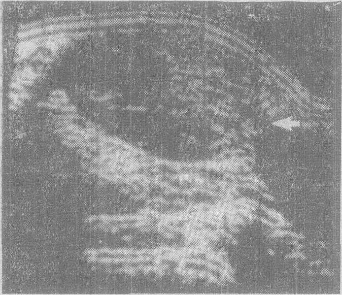 图5 子宫肌瘤声象图(箭头示肌瘤) 卵巢肿瘤 超声探测对卵巢单纯性、多发性和子宫内膜囊肿有肯定的诊断价值。囊性畸胎瘤存在实体和囊性部分,特别当出现毛发团的强烈回声或随体位改变的线状水平界面反射时,诊断较易。对囊腺瘤,如能探测到房隔及乳头状突起的实质结构反射时,可以做出诊断,但难于区分是否恶变。卵巢囊腺癌和腺癌等由于出现大片强烈不规则反射,诊断较易(图6)。总之,卵巢肿瘤的囊壁和房隔薄而光滑,有液性暗区或均匀细弱回声者,多为良性;囊壁和房隔厚而不规则,肿块区充满强烈不规则回声者,则多属恶性。超声探测对于浆膜下子宫肌瘤和卵巢实体瘤,卵巢囊肿和输卵管积水的鉴别尚有困难,但对于某些高张力临床上不易与实体瘤鉴别的卵巢囊肿,以及巨大卵巢囊肿与大量腹水的鉴别(表4),超声诊断有很大作用。