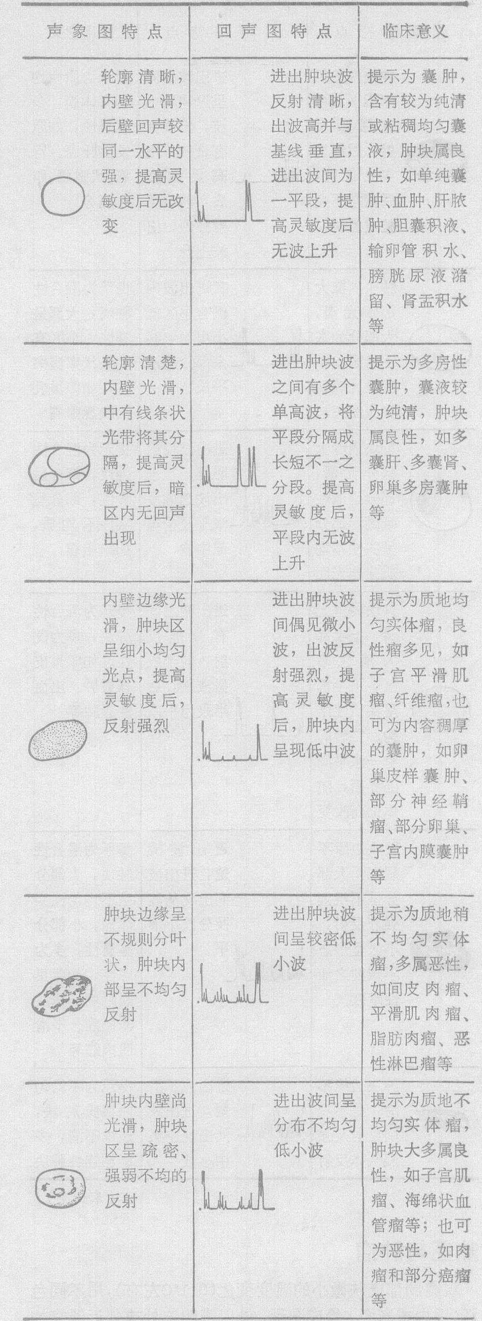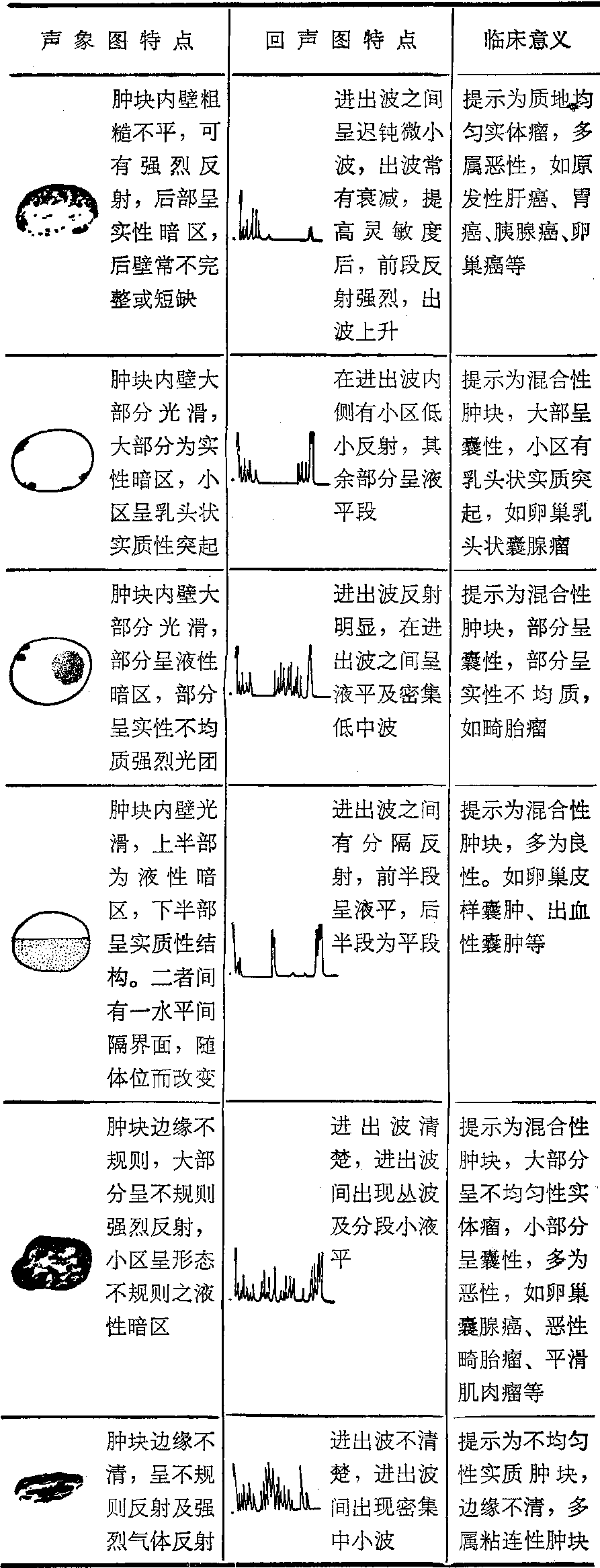 | 释义 | 肿瘤的超声诊断 肿瘤的超声诊断超声波应用于医学诊断已有三十余年历史。五十年代初,采用了脉冲反射式超声仪,应用范围日渐扩大;同时,为获得切面图象,提高诊断准确率,也开始了对超声显象仪的研究。七十年代以后,由于采用电子计算技术、灰阶显示和实时显象方法,在超声成象质量和探测方法上得到了明显的改进和提高,进展极快。超声探测目前已广泛应用于肝、胆、胰、肾、脾、胃、颅脑、眼、心、子宫、卵巢、浆膜腔积液等多种脏器疾病和肿瘤的诊断与鉴别诊断,特别是对于软组织和腹部肿块的诊断方面,具有很大的潜力。 表1 回声图象类型及临床意义