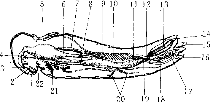 飞蝗(♀)的内部构造 1.口 2. 口腔 3. 咽 4. 食道 5. 嗉囊 6. 前胃 7. 胃盲囊 8.悬韧带 9. 胃 10. 卵巢 11. 回肠 12.结肠 13. 直肠 14.肛门 15. 上产卵瓣 16. 下产卵瓣 17. 总输卵管 18. 受精囊 19. 输卵管 20. 马氏管 21. 唾液腺 22. 唾液腺管 |