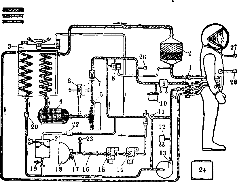 服装与背包生命保证系统示意图(引自Алексеев等,1973) 1.管道接头 2.净化罐 3.蒸发式热交换器 4.去湿器 5.风机 6.开动风机的传感器 7.反向阀门 8.泄漏氧气补偿器 9.二氧化碳分析器 10.氧分压传感器 11.活门 12.水压传感器 13.水泵 14,15.减压器 16.活门 17.氧气接嘴 18.氧气瓶 19.水阀门 20.反向阀门 21.水箱 22.反向阀门 23.压力计 24.蓄电池 25.水温传感器 26.温度传感器 27.无线电通讯接头 28.遥测接头 ☚ 航天员舱外用稳定和移位装置 飞船舱内气体环境 ☛ |