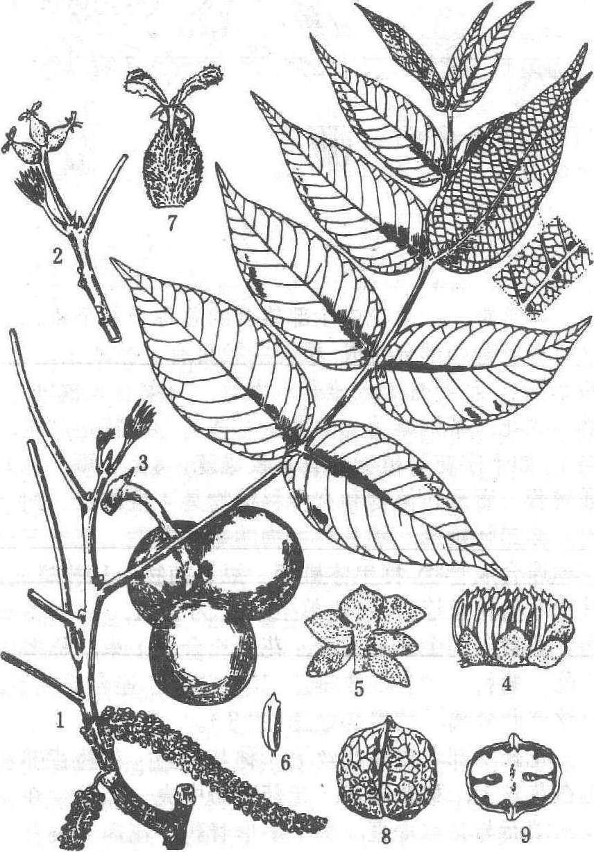 核桃(Juglans regia)是重要干果和油料树种,在中国已有2 000多年的栽培历史。栽培范围北起辽宁南部,南至广东、广西,东自山东,西至新疆,主产西北和华北。在新疆巩留山区有大面积野生核桃林。枫杨(Pterocarya stenoptera)为黄河以南各地、平原湖泊区造林、固堤护岸速生优良用材树种。山核桃(Carya cathayensis)为浙江产的著名木本油料和干果树种。化香(Platycarya strobilacea)果含单宁,为硝皮佳品和黑色染料。多数种的木材纹理直,结构细,不翘裂,供建筑、优良家具、枪托、航空、胶合板、造纸及火柴杆等用材。 胡桃科walnut family; Juglandaceae双子叶植物,落叶或半常绿乔木。x=16。具树脂,有橙黄色盾状圆形腺体。奇数稀偶数羽状复叶,互生,或稀对生,无托叶。花单性同株;雄花排成柔荑花序,具1枚苞片和2枚小苞片,花被4裂,或无小苞片和花被,雄蕊3至多数,1至多轮,花粉具3至多孔;雌花排成柔荑花序或为穗状,或单生,具1枚苞片和2枚小苞片,花被2~4裂,或无花被,子房2心皮,下位,最初1室,后基部为不完全2~4室,胚珠1枚。核果或坚果,种子无胚乳。共9属,约63种,分布北半球温带及热带;中国8属,24种,分布南北各省,主产长江以南,少数分布北部。核桃是重要油料和果树。枫杨为黄河以南平原湖泊区造林、固堤护岸速生用材树种。化香果含单宁可硝皮,提取黑色染料。 胡桃科双子叶植物。落叶或半常绿乔木,植株具芳香树脂。奇数稀偶数羽状复叶,互生,稀对生。小叶对生,稀互生,具锯齿,稀全缘。花单性。雌雄同株,风媒。雄花序常为葇荑花序,单生或数序成束。雌花序穗状或葇荑状顶生。核果或坚果,种子大,种皮膜质,子叶肉质,常2~4裂。世界9属约60种,多数分布北半球热带至温带。中国产胡桃属、山核桃属、枫杨属、化香树属、黄杞属、青钱柳属、喙核桃属7属,27种1变种。胡桃属、山核桃属等重要干果类果树,枫杨属等园林观赏或造林树种。材质好。 |