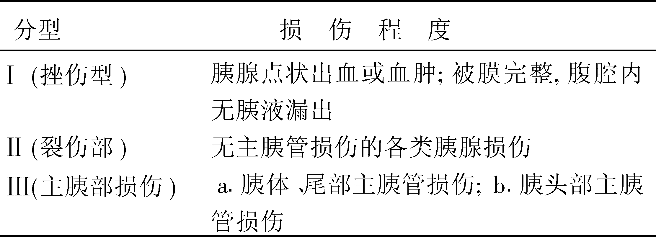 目前常用的胰腺外伤分类见下表。