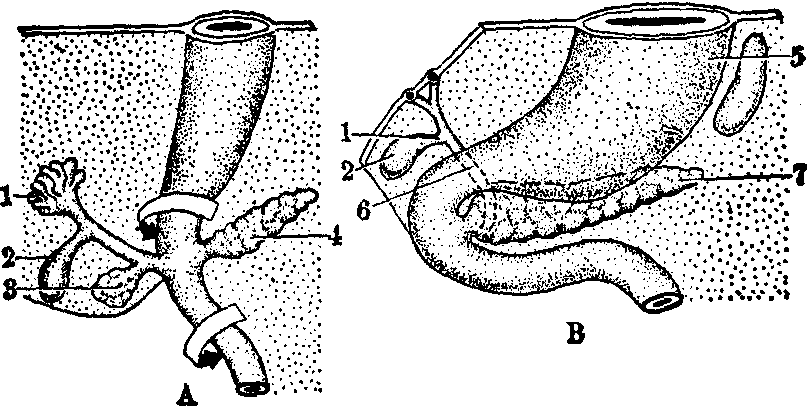 胰的发生 A.6周人胚,示背、腹胰芽形成 B.8周人胚,示背、腹胰合并 1.肝始基 2.胆囊 3.腹胰 4.背胰 5.胃 6.总胆管 7.胰 腹胰发育时,若分成二支环绕于十二指肠并与背胰融合,即形成环状胰,可造成十二指肠梗阻。如有胰组织分散侵生或出现于消化管如胃、肠和Meckel憩室等处的管壁内时,则该种组织称为副胰组织。 ☚ 胆囊与胆囊管的发生 脾的发生 ☛ |