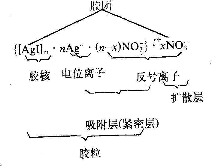 即在制备溶胶过程中,AgNO3过量,胶核吸附Ag+而带正电,反号离子NO-3一部分进入紧密层,另一部分在扩散层。m为组成胶核的分子数目,n为电位离子数目,(n-x)是吸附层 (紧密层) 中反号离子数,x是扩散层中反号离子数。故胶核是大量分散相物质的分子或原子组成的集合体,胶粒是胶核及紧包着它的吸附层所组成的一个能独立运动的带电粒子,胶团是由胶粒和其周围的扩散层所组成的整体。 ☚ 双电层 胶体的稳定性 ☛ |