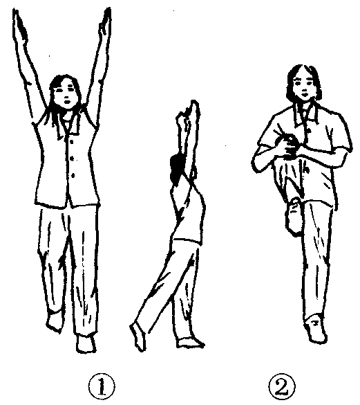 练功十八法第3套第5节。动作过程:立正站好。❶左脚先向前一步,重心前移至左腿上,右腿伸直脚尖踮地,同时两臂前上举,抬头挺胸,两掌心相对。(图2—4—137—❶)❷两臂经体侧下落,同时提右膝,双手抱右膝于胸前,左腿尽量伸直。(图2—4—137—❷)❸还原成动作❶。❹还原成预备姿势。❺~❽和❶~❹相同,只是换右脚上步抱左膝。共做4个8拍。练此功法要因人而异,年老体弱者可不做此功。此功法对臀、腿酸痛及屈伸困难者有一定治疗效果。