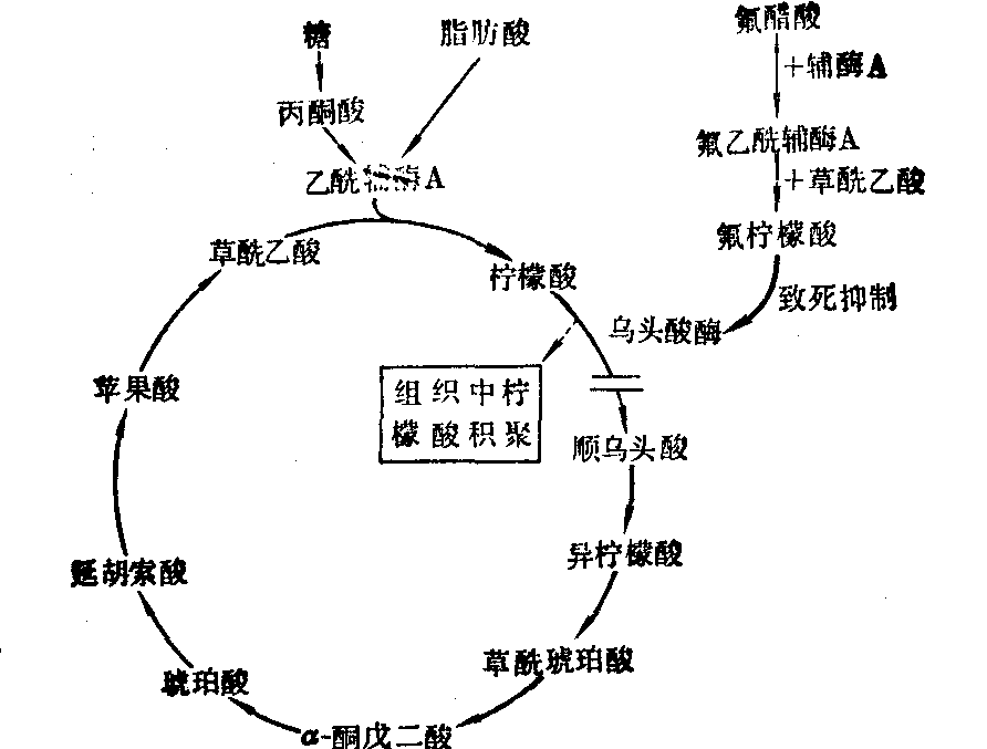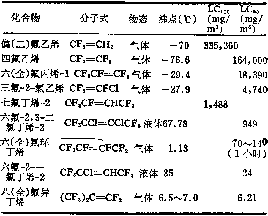氟代烃化合物对三羧酸循环的影响 单氟烃类包括单氟烷烃、单氟烯烃、单氟炔烃和单氟卤烷烃,它们与双氟烷烃一样进入体内后,基本上都先经ω-氧化,生成氟羧酸,再经过β-氧化。凡经上述代谢过程能生成氟醋酸者,毒性就大。单氟烯烃类的绝对毒性一般都很大,但因挥发性低,经呼吸道吸入的机会小,相对危险性不大。 多氟烷烃及多氟卤烷烃化学性能较稳定,其中低毒品种多数不在体内代谢,以原形从肺或肾排出。 多氟烯烃具有强烈的刺激作用,如八氟异丁烯在体内大都能氧化生成氟光气(COF2)和氟化氢(HF),成为致毒因子。 对沸点高,挥发性小的长链单氟烷烃应防止皮肤污染及误服。易挥发的多氟烯烃、多氟烷烃和氟卤烷烃应防止经呼吸道吸入。对氟聚合物关键在控制热解温度,加强烧结炉的密闭和排气。重视裂解残液的管理,进行综合利用和无害化处理。 急性中毒者应注意防止肺水肿,保护心、肝和肾。凡在体内能产生氟醋酸的毒物,其救治办法同氟醋酸 (参见《有机酸》)。 单氟烃类 毒性大小取决于其在体内能否生成氟醋酸,这与分子结构直链上碳原子数有关。单氟烃类化合物在体内经ω-氧化生成氟羧酸,凡羧酸部分含有偶数碳原子的,就能进一步经β-氧化生成氟醋酸,干扰正常的三羧酸循环; 而羧酸部分为奇数碳原子的,则生成氟丙酸或其他衍生物,毒性不大。如氯化氟乙酰(FCH2COCl)可在体内生成氟醋酸,毒性大,而它的异构体氟化氯乙酰(ClCH2COF)则生成氯醋酸,毒性小。 一氟三氯甲烷(F11,CCl3F)为无色、无味、无臭、不易燃的气体。沸点23.7℃。溶于有机溶剂。用作火箭燃料。麻醉作用弱。高浓度时可诱发心律不齐和抑制呼吸功能。经呼吸道吸入不发生转化,大部分以原形从肺排出。动物吸入30分钟的LC50:大鼠为10%(517g/m3),豚鼠和兔为25%(1,427.5g/m3 )。诱发心律不齐的浓度:小鼠为10%,大鼠和猴为25%。抑制呼吸(每分钟呼吸量)的浓度:小鼠和大鼠为2.5%,狗为10%。5%浓度下人出现眼刺激症状和轻度头晕等神经系统症状。脱离接触后可恢复。未见有关人慢性影响的报道。 多氟烃类 毒性比单氟烃小。其中多氟烷烃的毒性比多氟卤烷烃及多氟烯烃小。多氟烷烃的毒性常随分子结构中氟原子数增加而降低。多氟卤烷烃的吸入、经口、经皮毒性及对眼的作用均属低毒类。麻醉作用也随氟化程度增高而降低,但随氯、溴、碘原子数的增加而升高。毒性顺序是CBr2F2>CBrClF2>CBrF3。多氟烯烃易水解产生氟化氢,故毒性较大,分子结构中氟原子数增多或加入氯原子有使毒性增高的趋势,但规律不明显,因为多氟烯烃的毒性还与其对亲核试剂的特异敏感性有关。例如某些全氟烯烃的毒性与其亲核敏感性有一致的顺序,如(CF3)2C=CF2>CF3CF=CF2>CF2=CF2。又如反式2,3-二氯六氟丁烯对亲核试剂甲醇的敏感性比其顺式同分异构体大4倍,毒性亦相应增高3倍。 二氟一氯甲烷(F22,CHClF2)为气体。沸点-40.8℃。是制造四氟乙烯单体的基本原料。F22本身是低毒物质:但用它制备四氟乙烯时所发生的裂解气组分极复杂,含有氟烷烃及氟烯烃多种成分,毒性较大。对肺、心有特殊毒作用。造成急性肺水肿,严重者后期可有肺间质纤维化。心肌细胞也有损伤。 二氟二氯甲烷(F12,CCl2F2)为无色无味不易燃气体。沸点-29.8℃。虽大鼠吸入50~60%才出现轻度麻醉,但对猴可引起心律不齐、心动过速、心肌收缩力减弱和低血压。纯F12喷于兔眼可引起角膜损伤。大鼠吸入高浓度F12可导致肺水肿、心肌坏死。人吸入10%F12可在几分钟内丧失知觉。 2-溴-2-氯-1,1,1-三氟乙烷(氟烷)(CF3CHClBr)在常温下为无色、略带甜味的液体。沸点50.2℃。易溶于脂肪。遇光可缓慢分解放出氯化氢。用作全身麻醉剂。浓度1~2%足以导致麻醉。麻醉剂量下对心脏功能有抑制作用,表现为血压下降、心搏出量减少;1.8~2.3%浓度下,心肌收缩力降低至正常的70%。本品可提高心肌对儿茶酚胺类的敏感性,导致室性心律不齐,以至心室颤动。 重复使用氟烷的人常见肝脏损害。多次用氟烷麻醉的病人,肝脏坏死性病变的发病率达71%,远比使用其他麻醉剂为高。目前认为氟烷对肝脏的损害与其终末代谢产物三氟醋酸有关。氟烷对机体的作用是广泛的,它可阻断三羧酸循环,使苹果酸、柠檬酸和α-酮戊二酸堆积,影响肝脏代谢过程的正常进行。不合格的氟烷可能含有少量杂质,如六氟二氯丁烯,可加剧对肝和肾的损害,导致急性中毒死亡。 八(全)氟异丁烯[PEIB,(CF )2C=CF2]为无色气体。略带青草味。沸点6.5~7℃。易氧化生成氟光气及氟化氢。急性吸入毒性比光气约大10倍,是氟塑料工业中毒性最大的毒物。小鼠吸入2小时的LC50为7.36mg/m3(0.9ppm)。引起兔病理形态学改变的急性阈浓度为2.6~2.8mg/m3(0.32~0.35ppm)。主要造成严重的急性肺水肿。一般认为其毒作用与它在体内氧化生成氟光气、氟化氢及氟离子有关。但该三种物质本身的毒性表现均比八氟异丁烯轻,故不能完全以此来解释其毒作用原理。可能与其对亲核剂的高敏感性有关。其他几种氟烯烃对大鼠的急性毒性见下表。几种氟烯烃对大鼠的急性毒性(染毒4小时)