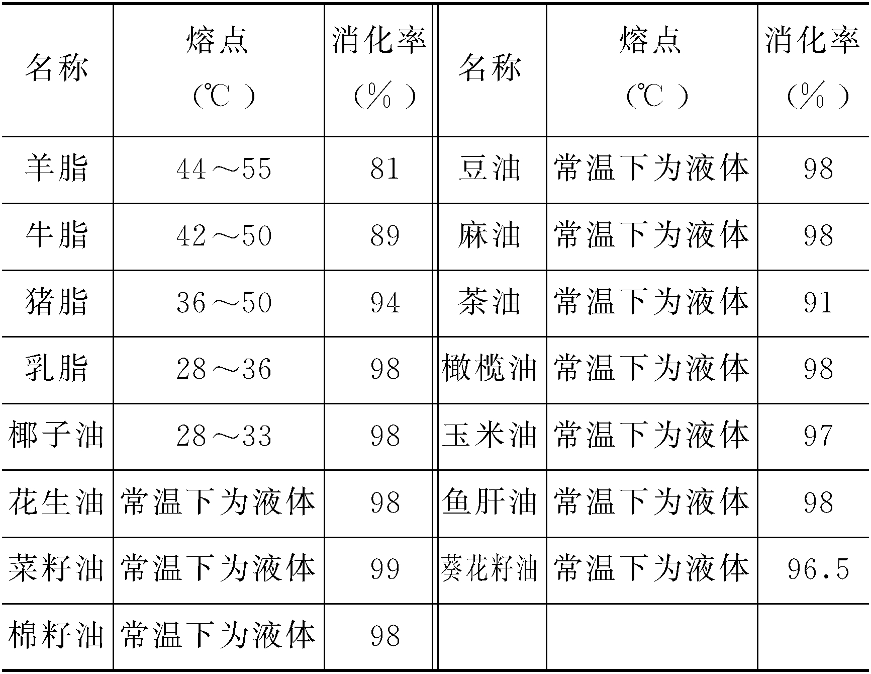 脂肪的消化率与其熔点有密切关系。熔点低于体温的,易消化;消化率高,营养价值高;熔点在50℃以上的脂肪酸不易消化。几种食用脂肪的熔点与消化率见下表: