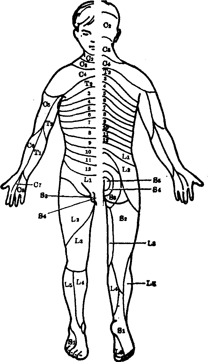 图1 脊神经支配的皮区 临床可作Queckenstedt试验、H反射试验、皮质诱发电位(S. E. P.)等检查协助诊断。 (1) Queckenstedt试验: 轻度挫伤奎肯试验及脑脊液化验检查可无异常发现。较重或严重脊髓挫伤奎肯试验可为部分性或完全性梗阻,脑脊液化验可见新鲜出血,偶见挫伤之神经组织碎片。脑脊液蛋白含量初期与出血量相一致,以后蛋白含量随有无梗阻而变化,梗阻者蛋白增加。X线平面检查,除颈椎和下腰椎外,脊髓损伤程度与脊椎骨折脱位成正比。脊髓造影的常用药为碘苯酯Myodil和Conray。脊髓轻度挫伤,碘剂可部分通过,严重挫裂伤可完全梗阻。梗阻平面与损伤平面一致,造影剂呈梳状,晚期因有粘连,梗阻平面以下呈蜡泪状,若硬膜下积液或血肿,碘剂可呈杯口样缺损。神经根囊撕裂,碘剂可进入囊内而呈束袋状。 (2) H反射试验: 即刺激腓总神经则腓肠肌收缩。该试验可测定脊髓中央灰质神经元联合的完整性。伤后H反射持续消失,则说明脊髓神经元联合破坏。 (3) S. E. P.: 如连续刺激周围神经,每秒20次以上,可在相应的大脑皮层区记录到累加的感觉诱发电位,持续约半秒钟双侧S. E. P.正常,说明后束传导正常。这一检查方法目前尚不能用于临床。 根据病史、症状、体征、X线片、脑脊液动力学及化学检查和特殊造影等一系列检查,诊断多无困难,但在损伤早期,要确定是器质性损伤还是暂时性的功能抑制,以及器质性损伤的程度,仍有很多困难。在鉴别诊断方面本病应与椎间盘脱出、脊髓空洞症,癔病性瘫痪、硬膜外脓肿、脊髓血管畸形出血、脊髓肿瘤或脊髓炎鉴别。