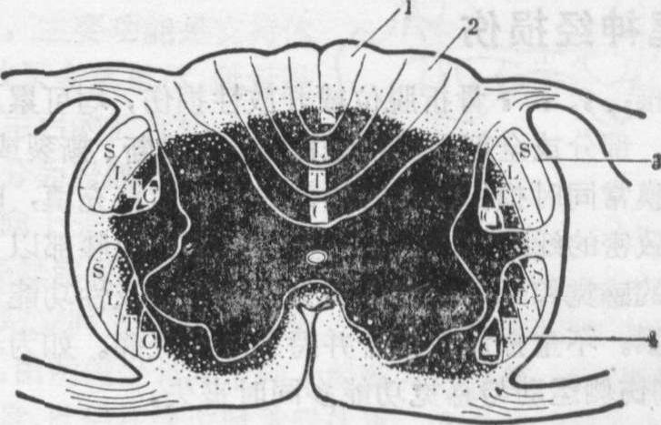 图4 脊髓前角损伤的横切面图 1.薄束 2. 楔状束 3.皮质脊髓侧束 4. 脊髓丘脑侧束 脊髓前部综合征 脊髓前半部损伤常累及脊髓前角、侧角、前束及侧束,甚至也可累及部分后束。临床上表现为损伤平面以下运动、痛、温觉,大小便功能、血管舒缩功能部分或全部丧失,唯后束功能大部或全部保留,脊髓前部综合征的产生可能与下列因素有关: ❶椎体后缘直接压迫脊髓前部; ❷脊髓前部血管损伤; ❸脊髓后束纤维粗大,对外伤有较强的抵抗力。 脊髓中央综合征 脊髓灰质血运丰富,对损伤敏感,因而脊髓挫伤后易发生中央出血性坏死,临床多见于颈髓损伤,其特点为近端(上肢)瘫痪较重,而远端(下肢)瘫痪较轻(图3)。因在皮质脊髓侧束中到颈髓或胸髓去的纤维靠近脊髓中央,故受伤较重,而到腰髓或骶髓去的纤维靠外,故损伤较轻。 脊髓前角或前根损伤 前角损伤多因前角内出血或空洞形成所致,可为单侧或双侧,可累及几个节段(图4)。临床表现仅为受累肌群呈弛缓性瘫痪。单纯神经根损伤较少,好发于单侧,累及范围较小。前根损伤后,神经膜套撕脱,脑脊液漏出,局部可形成囊袋状,碘剂造影可进入囊内,借此可与前角损伤鉴别。 ☚ 脊髓压迫 马尾神经损伤 ☛ |