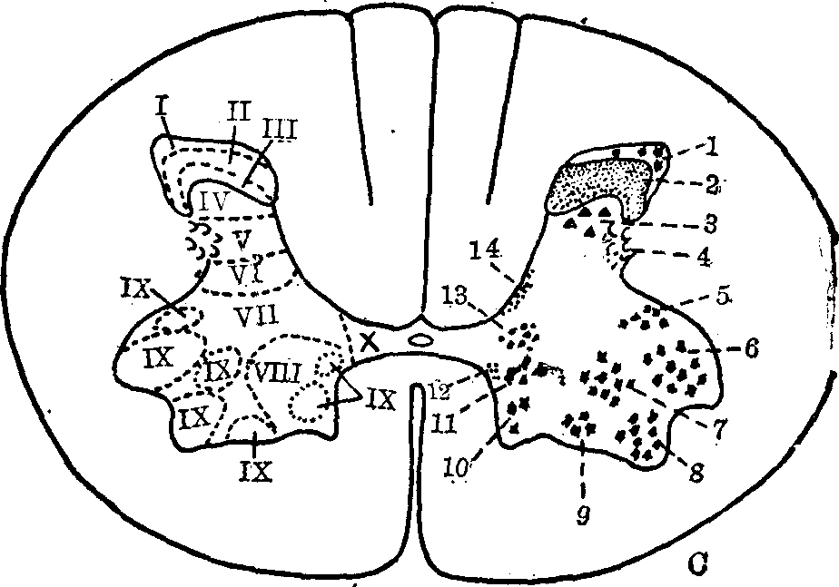 Rexed (1952、1954、1964)根据细胞构筑学将猫之脊髓灰质由后向前分成9层和1个区。其后发现在其他高等动物(包括人类)也有大体相同的分层现象,因而其分层法已被普遍采用。后角相当Ⅰ~Ⅳ层,其中Ⅰ层相当边缘层,Ⅱ层相当胶状质,Ⅲ~Ⅳ层相当后角固有核;Ⅴ层相当后角颈;Ⅵ层相当后角底,仅见于两个膨大节段;中间灰质相当第Ⅶ层,但在颈、腰骶膨大部的第Ⅶ层向前延伸进入前角; 前角相当(Ⅶ)Ⅷ~Ⅸ层,Ⅷ层含中间神经元,Ⅸ层为前角运动核;Ⅹ区相当灰质连合。从功能上看,第Ⅰ~Ⅳ层主要是脊髓的外感受区,并由此发出上行的纤维束。第Ⅴ~Ⅵ两层偏重接受本体感觉及部分皮质脊髓束和红核脊髓束纤维,故对于运动的精细调节十分重要。皮肤感觉及内脏感觉也可在Ⅴ层内会聚,此层细胞轴突也参加脊髓丘脑束。Ⅶ层位于前、后角之间,是个以与中脑及小脑联系为主的调节姿势及运动的反射中枢。Ⅶ层内外侧区内有中间内、外侧核,分别与内脏感觉和运动有关。Ⅷ层是一反射区,接受后根侧支及脑干的下行纤维,调节前角运动神经元的活动,并有大量脊髓内及对侧的联系。Ⅸ层是躯体运动系的最后共同通路。围绕中央管周围区域,充满胶质细胞和无髓神经纤维。