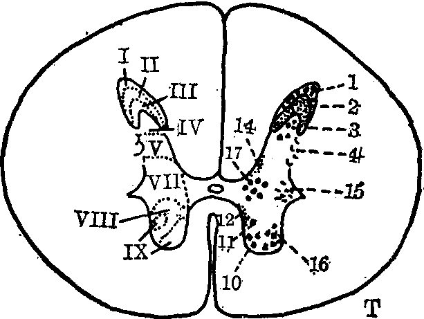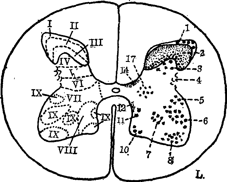 图左: Rexed分层 图右: 核团 C:颈髓 T:胸髓 L:腰髓 1.后角边缘核 2.胶状质 3. 后角固有核 4.网状结构 5.后外侧后核 6.后外侧核 7.中央核 8.前外侧核 9.前核 10. 前内侧核 11. 后内侧核 12. 前角连合核 13. 中间内侧核 14. 后角连合核 15.中间外侧核 16.前角外侧群 17. 胸核