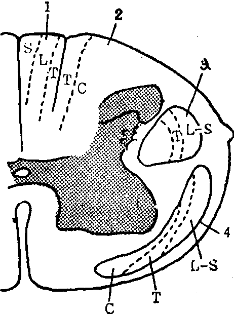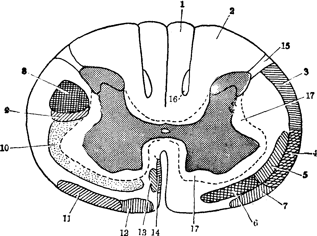 图2 脊髓纤维束的分层 脊髓内还有一些较小的上行束: 脊髓顶盖束将皮肤感觉传至上丘;脊髓网状束止于脑干网状结构;脊髓前庭束与前庭脊髓外侧束的纤维混杂; 脊髓橄榄束止于副橄榄核。内脏感觉的上行路不明,多混杂在脊髓网状束内。最近,发现有从脊髓上行直接到达下丘脑的纤维。 下行束 下行传导束起于脑的不同水平,下行至脊髓,直接或间接(通过中间神经元)止于前角运动神经元和自主神经节前神经元。下行纤维束主要从事躯体运动和内脏运动,调节肌紧张、反射活动以及感觉冲动的下行传导。 皮质脊髓束 起自大脑皮质,经过内囊、大脑脚底和脑桥基底部,集聚在延髓锥体内,大部分纤维经锥体交叉至对侧,构成皮质脊髓侧束,小部分延续为本侧之皮质脊髓前束。皮质脊髓侧束中也含有部分本侧纤维。 ❶皮质脊髓侧束位于外侧索内,居脊髓小脑后束之内侧。由于在腰髓下部以下无脊髓小脑后束,皮质脊髓侧束的位置即表浅。皮质脊髓侧束主要终止在脊髓灰质IV~VII层内,少量纤维止于前角运动神经元;起自中央后回的纤维的终止部位较起自中央前回者偏后,更多地影响后角的感觉功能。关于皮质脊髓束中纤维的定位排列现象尚无定论,临床观察趋于认为至上肢的纤维位于束之内侧部,至下肢者位于外侧部,但动物实验未能予以证实。 ❷皮质脊髓前束通常占起自大脑皮质的纤维的10~30%,位于前索内侧部,逐节交叉而止于对侧前角,也有小部分为同侧支配。此束主要见于胸髓以上,但可追踪其纤维至腰骶部。有一部分纤维自延髓锥体之外侧端分离出来,在同侧脊髓之腹外侧部下降,称为前外侧锥体束(Barnes束),由于个体差异,此束之出现率在1/5左右。皮质脊髓纤维大部终于中间神经元,仅有10~20%直接止于前角。大部分纤维止于锥体的对侧,也有一定数量止于同侧。黑猩猩约有20~25%的纤维属于同侧支配。止于颈髓者约占皮质脊髓束纤维总数的50%,止于胸髓者占20%,止于腰骶髓者占30%。曾有人提到皮质脊髓束中混有上行纤维,但未被证实。锥体束损伤,出现随意运动丧失,肌张力增高,深反射亢进,浅反射减弱或消失,同时出现病理反射Babinski征,Hoffmann征等;因周围神经健全,故无肌萎缩,称为痉挛性瘫痪(或硬瘫)。 红核脊髓束 一般认为人类的红核脊髓束很小,但证据不足。此束走在皮质脊髓侧束的前方,终止于Ⅴ~Ⅶ层。 前庭脊髓外侧束 发自前庭神经外侧核,走在前索的前部,止于Ⅶ~Ⅷ层。仅有少数纤维可被追踪至Ⅸ层,但刺激前庭神经外侧核可单突触地兴奋伸肌运动神经元,可能是因为前角运动神经元的树突可伸入Ⅶ~Ⅷ层内。 前庭脊髓内侧束 较小,发自前庭神经内侧核,走在前索内侧部,仅见于颈髓,影响头、颈部运动。 顶盖脊髓束 发自上丘,走在前索之前内侧,主要见于颈髓,终于Ⅵ~Ⅶ层,为视、听觉的反射道路。 网状脊髓束 纤维分布在前索、外侧索的广泛地区。 ❶延髓网状脊髓束: 来自两侧延髓网状结构,位于红核脊髓束之前方和脊髓丘脑侧束之内侧。延髓网状脊髓束与人类自主性呼吸活动有关。 ❷脑桥网状脊髓束: 主要起自同侧脑桥,位于前索。 内侧纵束 位于前索内侧缘,其纤维起自中介核及Darkschewich核,前庭脊髓内侧束的纤维也混入此束。内脏运动下行纤维多散在网状脊髓束内。 孤核脊髓束 于脊髓两侧下行,止于膈神经核、前角和中间外侧核。 近年发现下丘脑室旁核等有纤维直达脊髓,司内脏性运动。此外还发现有从中缝核、蓝斑及网状结构内某些单胺类神经元下行至脊髓的纤维,广泛地影响脊髓的活动,有的对于脊髓的感觉功能,尤其是痛觉的传导及痛反射有较大的影响。 ☚ 脊髓的灰质 脊髓的血管 ☛ |
