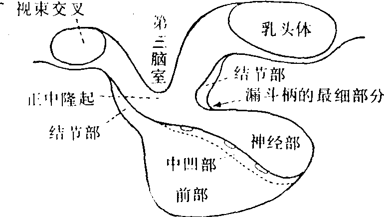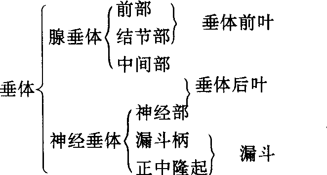 脑垂体的血管分布 分布于脑垂体的血管主要有:❶垂体下动脉。来自颈内动脉,分支进入神经部形成窦状毛细血管网,然后汇合成集合静脉入垂体周围的静脉窦; ❷垂体上动脉。来自基底动脉环,从结节部上端进入垂体茎,在正中隆起和漏斗柄处形成襻状的初级毛细血管网,然后汇集成十数条门静脉,经结节部进入远侧部再形成次级毛细血管网,构成垂体门脉系统。远侧部的毛细血管也汇入集合静脉再注入垂体周围的静脉窦。下丘脑有关核团的神经分泌细胞产生的激素,有多种释放激素和释放抑制激素。由其轴突输送到漏斗柄处,经垂体门脉系统到腺垂体,调节远侧部各种细胞的分泌活动,共同构成下丘脑腺垂体系统(图2)。 脑垂体hypophysis动物体内与丘脑下部相连的内分泌器官。由腺垂体和神经垂体两部分构成。前者起源于由原口的上皮背侧内陷成的拉克氏(Rathke)囊,包括远侧部、中间部和结节部;后者由间脑底部下垂形成,包括神经部、正中隆起和漏斗柄。各组分的位置和体积在各种动物有较大差别。腺垂体由排列成索的内分泌细胞和丰富的窦状毛细血管组成,其内分泌细胞分泌促生长素、催乳素、促甲状腺激素、促性腺激素、促肾上腺皮质激素、黑色素细胞刺激素等;神经垂体主要由起自下丘脑视上核和室旁核的无髓神经纤维和神经胶质细胞构成,视上核所分泌的加压素(抗利尿素)及室旁核分泌的催产素经轴突运输至神经垂体释放入毛细血管。脑垂体是动物体重要的内分泌器官,其分泌活动受下丘脑调节,两者在结构和功能上联系密切(见“下丘脑-垂体系统”)。 脑垂体 脑垂体naochuiti又称垂体。人体最重要的内分泌腺。靠垂体柄(漏斗柄)与下丘脑相连,悬垂于脑下方的垂体窝内。成人的垂体约重0.5~0.6g,女性略大。根据胚胎学和组织学、生理学,将垂体分为以下几部分: