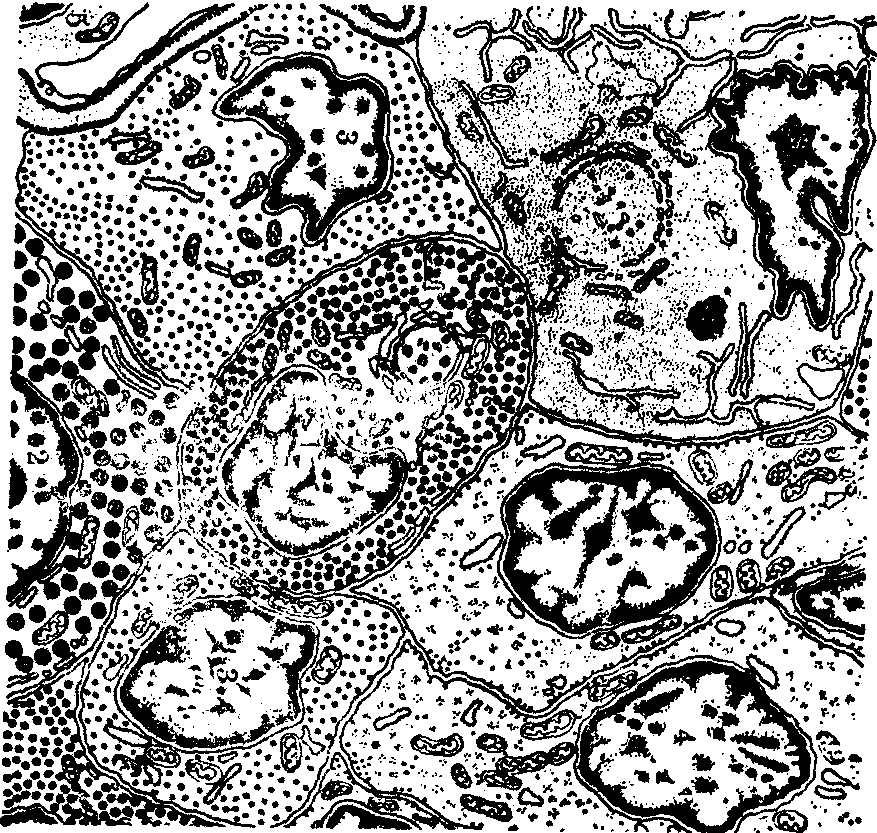 图2 腺垂体细胞超微结构模式图 1.促生长激素细胞 2.催乳激素细胞 3.促性腺激素细胞 4.促甲状腺激素细胞 5.毛细血管 嗜碱细胞不易被苏木精染色,在普通染色切片中不易辨认,但易被安尼林蓝染色,PAS反应阳性。它们比嗜酸细胞大,卵圆或多角形,多分布于前叶的中心和前部(彩图4),可分三种: ❶促甲状腺激素细胞:又称β2细胞,较大,呈多角形,常成群。胞质含许多小而致密的分泌颗粒,直径100~150nm,位于胞质外周部(图2)。动物实验表明,切除甲状腺可使此种细胞增多和肥大;注射甲状腺素,可致它们萎缩。免疫细胞化学法已定位促甲状腺激素于此种细胞。此激素为糖蛋白,它维持甲状腺滤泡上皮细胞的构造和分泌功能; ❷促性腺激素细胞: 即δ细胞,为圆形,大小不等,单个散在于细胞索中。胞质中高尔基复合体明显,粗面内质网较多,有许多致密的分泌颗粒,直径约150~250nm(图2)。它们分泌卵泡刺激素和黄体生成素,两者都是糖蛋白。但由一种细胞产生两种激素,还是两种细胞各产生一种激素,还未确知。卵泡刺激素促使卵巢的卵泡生长和卵泡细胞分泌雌激素,并在黄体生成素的协同作用下,使卵泡成熟、排卵和形成黄体。它还促进睾丸生精小管细胞分裂和生成精子。黄体生成素也名间质细胞刺激素。它在卵泡刺激素的作用基础上,促使排卵的卵泡形成黄体和维持黄体的分泌功能; 它还促进睾丸间质细胞分泌睾酮; ❸促肾上腺皮质激素细胞:为卵圆形或星形,有的有突起,多分布于远侧部中心偏前,也见于结节部和中间部。胞质密度低,粗面内质网少,分泌颗粒少,直径200nm,常集中于胞质外周部。切除动物的肾上腺皮质可致细胞变大和增多,并含较多的分泌颗粒。免疫细胞化学法已表明此种细胞分泌促肾上腺皮质激素,并显示此种细胞和中间部的一些细胞可能分泌促黑色素细胞刺激素。这二种激素是由一种还是两种细胞产生,还不清楚。对于此种细胞是属于嗜碱细胞还是嫌色细胞,也有不同意见。 嫌色细胞呈小圆形或多角形,胞质少、着色淡,细胞界限不清。光镜下未见胞质含分泌颗粒(彩图4)。它们常成群位于细胞团中。先前认为它们是未分化的贮备细胞。电镜研究见远侧部只有少数细胞不含分泌颗粒,比光镜所见的少得多。现认为光镜下所见的嫌色细胞,多数是脱颗粒的嗜酸和嗜碱细胞。嗜酸和嗜碱细胞的分泌活动是周期性的,细胞释放激素后,胞质只有少数分泌颗粒或不含颗粒。各种细胞很少见有丝分裂和退化。如确有未分化的细胞,也只占少数。 (2)结节部:此部呈薄层围绕漏斗柄,厚约25~60μm,漏斗柄前面最厚,后面薄或缺如(图1)。因进入前叶的主要动脉和脑垂体门脉都由此部穿行,故此部血管最多。细胞成索纵向配布于血管之间。此部的细胞有未分化细胞及一些较小的嗜酸和嗜碱细胞。多数细胞为立方或柱状,胞质含许多小颗粒和大量糖原,有时有胶体滴和脂滴。细胞有无分泌激素的功能还未确知。 (3) 中间部: 在多种哺乳类,远侧部与神经部间有裂隙分隔。中间部较发达,紧贴神经部,由多层嗜碱细胞组成。人胚胎期时有明显的裂缝,中间部为典型的复层上皮,幼儿时仍可有裂缝,但成年时多已消失。成人的此部很小,只占脑垂体的2%(图1),由一些从裂缝演变的大小不等的囊泡和嗜碱细胞组成。囊泡由立方或柱状的有纤毛细胞组成,腔内含黄色胶状物。嗜碱细胞较小,柱状或多角形,聚成不规则的细胞索或团,并常侵入神经部。它们很象远侧部的嗜碱细胞,胞质含200~300nm的颗粒。颗粒含糖蛋白,PAS反应阳性,但此物的性质同已知的激素不符。此部分泌的唯一的激素是黑色素细胞刺激素,为一种与促肾上腺皮质激素化学结构相似的多肽,故设想细胞合成的激素可能与糖蛋白结合贮存于颗粒内。在神经部靠近中间部处常见管状腺,类似唾液腺,四周有弥散的淋巴组织,其意义不明。中间部的功能主要是从两栖类和哺乳类的研究取得的。此部可能主要产生黑色素细胞刺激素。切除蛙的中间叶可致皮肤颜色变浅;如将中间叶植入蝌蚪,则使皮肤颜色变深。从猪和人脑垂体中提取出两种黑色素细胞刺激素都是多肽。一种激素呈强碱性,称α-黑色素细胞刺激素;另一种显弱酸性,称β-黑色素细胞刺激素。它们的氨基酸排列顺序与促肾上腺皮质激素分子的一段相同,故促肾上腺皮质激素也有与该激素相似的效应。此激素可致两栖类皮肤载黑色素细胞中的黑色素颗粒分散,使皮肤颜色变深。它也促进黑色素细胞合成色素。在哺乳类,其主要作用似在于黑色素生成。人患Addison病时皮肤颜色变深,是由于脑垂体释放过多的肾上腺皮质激素和促黑色素细胞刺激素所致。人妊娠时皮肤出现色素斑,可能是上述一种或二种激素分泌增多所致。 腺垂体的分泌功能受丘脑下部的调节。某些内分泌腺对垂体促激素的反馈效应也须通过丘脑下部才能实现。将大鼠脑垂体移植到肾被膜下,则其促性腺、促甲状腺和促肾上腺皮质的作用显著下降或消失。移植的脑垂体细胞也有明显的改变。将移植的垂体再移回原处并重建正常的血管分布,则它的构造和功能可再复原。损伤丘脑下部不同区域,能有选择地干扰腺垂体某种激素的分泌。由此设想,丘脑下部某些区域的神经细胞产生特殊的物质控制腺垂体各种激素的合成和释放。有些证据表明,丘脑下部的大细胞核团(如视上核和室旁核)和小细胞核团(如弓状核、背内侧