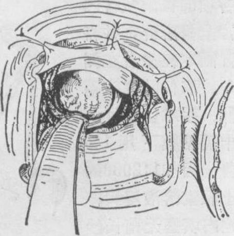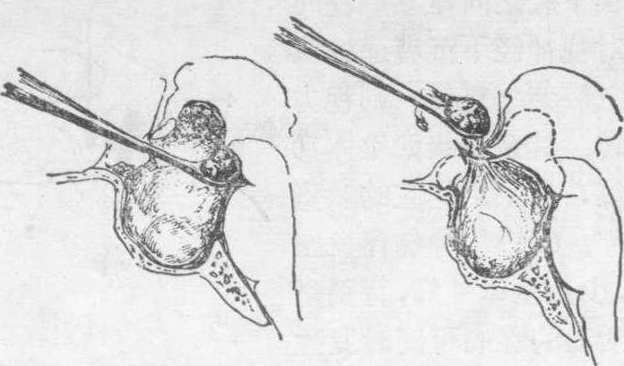 图7 肌肉块填塞鞍腔防治术后脑脊液漏 垂体柄切断术 可以阻断垂体的分泌功能,被用以治疗与垂体前叶激素密切相关的肿瘤,特别是晚期乳腺癌和前列腺癌的更加恶化。手术经额下入路,将额叶牵向后上方,显露出垂体柄并在其上夹上一银夹,继将垂体柄剪断。剪断垂体柄时要紧挨着垂体一侧,且不可将垂体柄向下牵拉,否则易损伤下丘脑。由于术后垂体门脉系统容易迅速再生,使垂体恢复其分泌功能,所以这种手术的效果难以持久。 垂体切除术 手术的目的是将正常垂体完全切除,以消除其分泌功能。手术适应证为晚期乳腺癌、前列腺癌、糖尿病性视网膜病变。手术可经额下入路,首先切断垂体柄,挖除全部垂体,再用Zenker液毁坏可能残留的垂体组织。垂体切除术亦可经蝶窦入路进行,暴露鞍底后将鞍底硬脑膜作十字形切开,从垂体表面与各硬脑膜瓣间进行分离,显露出整个垂体的前面,再轻轻地将垂体向下压,找出硬脑膜与垂体表面的间隙,沿此继续分离垂体上面,达垂体柄及鞍膈孔为止。如鞍膈孔较大,可在蝶鞍腔内发现一蛛网膜憩室,慎勿将它撕破。此时即可用尖端圆钝的小剪,紧挨着垂体表面,将垂体柄作低位剪断(图8)。因为切断的位置越高,越容易导致永久性尿崩症。接着从外侧、下方和后方作同样的分离,完整地取下垂体。在使用手术器械在鞍内操作的各步骤,均须在电视监视下进行,以防器械活动范围超过了鞍膈水平。