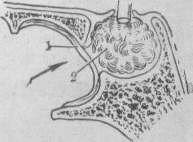图4 经蝶窦入路时的切口 (2) 经蝶窦入路:术前需拍片了解蝶窦的结构(图3),术前三天开始作鼻腔手术前各项准备。气管内插管全身麻醉,并将插管固定在患者左侧口角。取仰卧位头稍后伸。手术切口处及鼻中隔粘膜下用1%普鲁卡因加1:2000的肾上腺素溶液浸润。口腔内填塞无菌长纱条。铺巾时只露出鼻尖和上唇。在上唇上齿龈交界处作两犬齿间的横切口(图4)。由鼻前嵴突及鼻底剥离切口下的粘膜骨膜层,切除鼻前嵴突,剥离鼻底粘膜并将鼻中隔粘膜推向两侧。切除鼻中隔前部软骨的下1/3部分,并留下为以后填入蝶窦用。再向后上剥离,显露出犁骨前端亦切除之。插入鼻腔镜,此时即显露出整个蝶窦底部。由蝶窦口向后切除蝶窦底和其中隔。将蝶窦粘膜切除直至显露出鞍底(图5)。将双目手术显微镜对准手术野,在X线电视下观察,凿开鞍底,使之成为宽1.5cm、长1.0cm的骨窗,将硬脑膜电凝后作十字形切开,这时观察肿瘤组织是否在表面露出,有时肿瘤组织自行挤入蝶窦,用取瘤钳或刮匙,分块切除瘤组织(图6)。当鞍内相当空虚时,鞍上部分肿瘤,常亦自行沉落入鞍内,继续进行切除,直到看见正常腺体组织或鞍膈。为了防止发生脑脊液漏,在切除鞍膈处肿瘤时,勿将此处的蛛网膜撕破。在切除鞍底部肿瘤时,不可将硬脑膜层当作肿瘤包膜广泛切除,因为此系由海绵窦的内侧壁延续到鞍底的,损伤后可致严重出血。肿瘤全部切除后,鞍内空腔用肌块填塞,将手术中切下的鼻中隔软骨嵌于鞍底骨窗的两缘,防止肌块脱出。用丝线缝合牙龈处切口。两侧鼻腔均匀地用纱布条填塞。手术后按一般鼻腔手术后的原则处理,并按情补充激素。预防脑脊液鼻漏是本手术的一个特殊问题。如术中突然大量脑脊液流出,表明鞍膈处的蛛网膜已破裂,可用肌块填塞鞍腔,或从大腿外侧取一片带有肌肉的阔筋膜片(图7),将带肌肉的一面塞进鞍内,让它周围的筋膜紧贴在蝶窦上壁,再在筋膜后面填塞纱布条。术后第三天逐步松动纱布条,一周后取出纱条。如此后仍有脑脊液漏,可作腰椎穿刺放置导管进行持续引流,直至漏液停止。