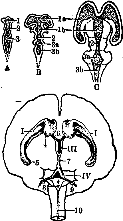 1.前脑腔 1a.端脑腔 1b.间脑腔 2.中脑腔 3.菱脑腔3a.后脑腔 3b.末脑腔 I.侧脑室 III.第三脑室 IV.第四脑室 4.侧脑室前角 5.侧脑室下角 6.室间孔 7.水管 8.正中孔 9.外侧孔 10.脊髓中央管(斜纹线为脉络丛)