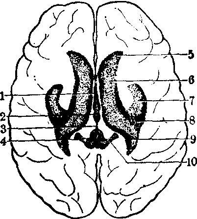 图2 脑室顶面 1. 第三脑室 2. 松果体上隐窝 3. 中脑导水管 4. 第四脑室 5. 侧脑室前角 6. 侧脑室体部 7. 侧脑室下角 8.侧脑室三角部 9. 侧脑室后角 10. 第四脑室侧隐窝 侧脑室:位于大脑半球内部。分为前角、体部、三角区、后角及下角五部。前角:又称额角,居额叶内,后方以室间孔为界,呈袋状,向前外稍下伸入额极,两侧前角的冠状切面呈蝴蝶形。前壁和顶部为胼胝体嘴部及膝部。内侧壁为透明隔及穹窿。底部倾斜同时为外侧壁,稍向内突,由尾状核头部内侧所组成。体部:居顶叶内,为一狭长并呈轻微弓形,冠状切面呈三角形。分界限由室间孔向后到胼胝体压部,两侧体部在后部逐渐相互分开。顶界为胼胝体。内界为透明隔后部。底向上外倾斜并在外上角与顶界相连。底部结构由向外为: 穹窿、脉络丛、丘脑背面外侧部、终纹、终静脉及尾状核。三角区:为体部、后角及下角的交汇处,脉络膜球位于此处,由脉络膜前动脉供应。后角: 又称枕角,居枕叶。形态变异很大,且可不对称,常较小。甚至缺如,顶界和外壁由胼胝体毯形成(即胼胝体压部及体部发出的片状纤维)。内壁有两个隆起,背侧者为后角球,是由胼胝体大钳纤维所形成,前腹侧者为禽距,是由距状裂前部陷入所成。下角:又称颞角,居颞叶内。行向外下,远端稍向内弯,距颞极约2.5cm。顶界为颞叶白质,内侧缘为终纹及尾状核尾部,末端连杏仁核。底部由内向外为:海马繖、海马及侧副隆起。侧脑室内的脉络丛在室间孔处与第三脑室内脉络丛相续,向后经体部,三角区折向下角。前角及后角无脉络丛。 第三脑室: 为两侧间脑间的狭窄裂隙。高约2cm,宽约0.5cm,长约4cm。矢状面近似四边形。前壁: 由上而下为穹窿柱,前连合,终板及视隐窝。侧壁: 大部为丘脑和下丘脑的内侧面。有中间块(又称中间连合)连结两侧丘脑,中间块腹侧有丘脑下沟,此沟前起室间孔,后至中脑导水管,为丘脑和下丘脑的分界。沟以下的侧壁和底部为下丘脑和丘脑底部形成。顶部: 为一薄层上皮细胞构成的中间帆,有左右并行的脉络丛,由脉络膜后动脉供应。由室间孔到松果体上隐窝处,还有大脑内静脉。后壁:自下而上有中脑导水管,后连合,松果体隐窝和松果体上隐窝。底部:由前向后为视交叉、漏斗隐窝(漏斗、灰白结节)、乳头体、后穿质、大脑脚和中脑盖部。 透明隔:透明隔为两层薄膜所形成的间隔,位于侧脑室前角的后部,构成侧脑室前部的内侧壁。在二层薄膜中间有一潜在的间隙,称透明隔腔,此腔如与脑室相通时,作气脑造影或脑室造影可见气体进入该腔,称为第五脑室。透明隔可以缺失或有囊肿形成。 中间块:是位于第三脑室中心稍上方的灰质块,它连接两侧丘脑,又称中间连合。在约20%的人体中,中间块缺如,个别也可有两个中间块,有时中间块较大,范围自室间孔向后到第三脑室中央(并不引起梗阻),可误诊为肿瘤。 中脑导水管:为连接第三脑室和第四脑室的狭小管道,直径0.1~0.2cm,长约1.5cm。背侧为四叠体,腹侧为中脑被盖。后连合若下突可使导水管上端稍狭。 第四脑室: 位于颅后窝内。腹侧为桥脑及延髓。背侧为小脑。下端连延髓封闭部的中央管。上端接中脑导水管。两侧各有一狭窄弯曲的延长部,称侧隐窝,在绳状体的背面通向外侧,末端开口于桥脑侧池,是为第四脑室侧孔(Luschka孔),孔内脉络丛通过。第四脑室的下端有正中孔(Magendie孔)与小脑延髓池相通,是脑室内脑脊液主要流出口。正中孔以下两侧小脑扁桃体间的间隙为第四脑室溪。第四脑室底部称菱形窝。分上、中、下三部。上部呈三角形,尖端向上,通向中脑导水管。中部较宽,向两侧到达侧隐窝。下部亦呈三角形,尖端向下,通向延髓封闭部的中央管。菱形窝中部表面有横行纤维束称听髓纹,作为桥脑与延髓的分界。髓纹下方由中间向外侧有三个三角形区;内侧者为舌下神经三角,其下面为舌下神经核。中下部者为迷走神经三角又称灰翼,其下面为迷走神经背核。外侧者为听区,此三角区也稍向菱形窝中部延伸,其下面为耳蜗和前庭神经核。髓纹上部的内侧有圆形隆起称面丘,其深部为面神经绕过外展神经核之处。面丘上接内侧隆起,其外侧缘为界沟,是三叉神经内侧的运动核和外侧的感觉核之分界处。菱形窝最下端呈三角形薄板,称为闩(Obex)。第四脑室顶形如幕状尖顶,由前髓帆、后髓帆以及附着在后髓帆内的两侧脉络丛组织所组成,此处脉络丛由椎动脉及基底动脉的小脑支供应。 第五脑室及第六脑室:第五脑室位于两层透明隔之间,又称透明隔腔。前界为胼胝体膝部。上方为胼胝体干。后为穹窿柱与胼胝体的汇合点。下方为胼胝体嘴部和穹窿体部。侧壁为透明腔隔膜。第五脑室正面和侧面均呈三角形,透明隔腔如形成第五脑室,则一般与第三脑室相通。有时此腔形成囊肿阻塞室间孔引起颅内压增高。第六脑室位于第五脑室后部,胼胝体之下,海马联合之上,又称Verga腔或Verga脑室。借穹窿与第五脑室隔开。两侧为穹窿后柱,后以胼胝体压部所限。为一三角形间隙,又称三角脑室或穹窿脑室。第五、六脑室腔内壁均无室管膜覆盖,故并不属真正的脑室。正常造影时显示机。会不多,在阻塞性脑积水时较常见到。 ☚ 痉挛性斜颈手术治疗 脑脊液分泌与吸收 ☛ |