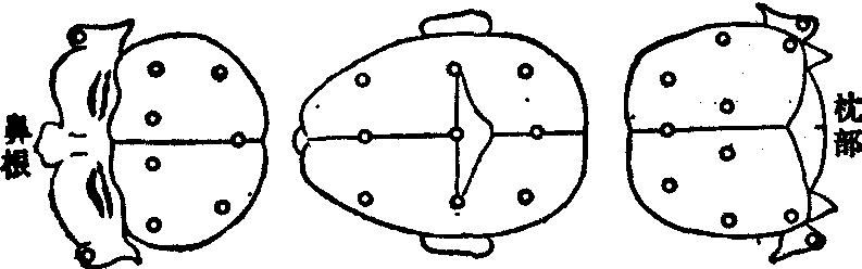 图1 脑电图机结构原理方框图 (1) 输入部分: ❶导联选择: 脑电活动通过放置于头皮上的电极和电极连接线导入电极盒,电极导线插头插入盒上,相应孔位号码须与导联选择器转换开关上的号码一致,电极盒上的电阻测定器可测量每一电极及导线的电阻。导联选择器的输出接到各前置放大器; ❷定标装置:由于电池经分压电阻分压,供描记前测定描笔绝对摆幅; ❸电阻值测定器:测量电极与皮肤间的接触电阻和两电极间及电极对地间电阻。一般头皮电阻应<5kΩ,否则会导致波形失真及干扰串入。 (2)放大部分: ❶前置放大: 常为多级阻容耦合低频放大器,采用负反馈差分放大电路,有高的共模抑制比(>100dB)和低漂移及低噪声的特点; ❷后级放大: 又称功放,一般采用推挽式负反馈直接耦合放大,以推动描笔的运动。电路中有调节电位器进行描笔零点调整。 (3) 调节部分: ❶增益调节器: 调节脑电图机每导联的放大倍数,采用电阻分压式同轴开关,可粗调(每档增减6dB)和细调(6dB以内增减)。此外还有同时调节各导联放大器的总增益调节器; ❷时间常数调节器:又称低频滤波。当输入端输入一方波时,其波幅从100%下降到37%时的时间为时间常数,与一阻容耦合低频放大器的电阻、电容参数有关。脑电时间常数为0.3s。各导分别都有时间常数调节器; ❸高频滤波器:又称高频衰减,是利用不同容量的电容器来滤掉高频成分。 (4)记录部分: 记录笔(又称描笔)多为墨水笔式,用动铁式电流计带动偏转,以记录脑电图。描笔记录要有适当的阻尼来控制记录器的频响。脑电图机的频响一般要求在60Hz以内。记录纸由微型同步电机来传动,走纸速度少则三种(1.5、3和6cm/s),多则可有6种。 电极的放置 监测临床脑电图,放置电极最常用的方法是国际联合会的10~20系统(如图2)。常用的电极连接有二种型式: ❶双极导联; ❷单极导联(单极导联和耳垂电极或单极导联和中心电端)。另外,还有Gibbs电极置法,其特点是放置电极数少,操作简便。电极放置时,头皮表面描记区先用95%酒精或丙酮脱脂,分开头皮,涂以导电膏,用松紧带固定帽固定电极,圆柱形银质支架式电极用饱和盐水作接触剂。针状电极为半寸长的28~30号针灸针,进针头皮时应严密消毒以防感染,其优点是接触良好,无需固定帽。耳垂电极有弹簧夹式和螺旋式,用前需氧化处理,并对耳垂皮肤脱脂,用饱和盐水或导电膏作接触剂。安放好电极后应测量电极与头皮间电阻值,要求在20kΩ以下,最好为5kΩ以下。不然,头皮应重新脱脂,重置电极。