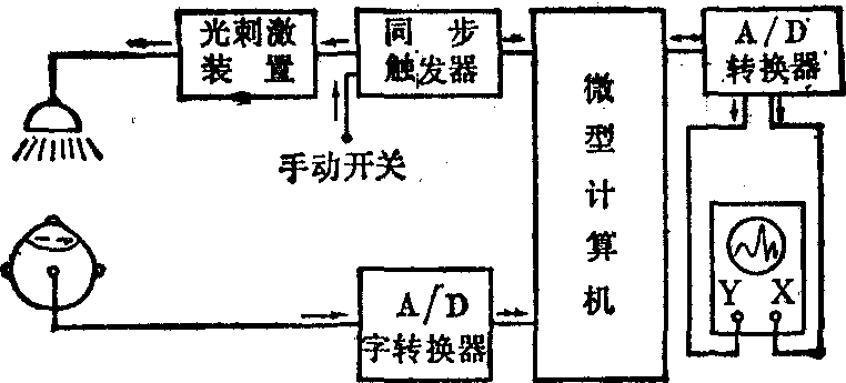 图2 10~20系统电极放置法 诱发脑电描记 诱发脑电描记除采用上述电极导联方式外,需用刺激器和迭加仪来进行。 (1)刺激器: 由脉冲信号发生器和执行器件组成。脉冲发生器的脉宽、强度和频率均可分档调节,还设有手控触发脉冲,其脉冲发生时刻亦可调节。执行器件通常有声、光二种,即用Xe(氙)灯作光源的亮度为8~60万烛光的闪光器,或发出频率125~8,000Hz声音和噪声的耳机。此外还有体觉诱发刺激、嗅觉诱发刺激和味觉诱发刺激等,它们的执行器件和刺激部位不同。 (2)迭加仪: 是用来迭加多次刺激产生的诱发脑电位波形,提高信号与噪声比的装置。有模拟式和数字式两种。 ❶模拟式: 分照相底片重复曝光法和电容存储迭加法。前者又称为相关积累法,用于诱发反应电位波幅等于或大于背景波波幅的情况,利用置于示波管前的照相机,重复摄取示波屏上诱发脑电波扫迹来获得迭加结果;后者利用电容器来收集迭加多次诱发反应的电荷量,结果由示波器显示出来。模拟法分辨性能差; ❷数字式:整个仪器以计算机为中心,配以模拟/数字转换器、数字/模拟转换器、同步触发器、刺激器和示波器(图3)。计算机以微型计算机为主,计算机由诱发反应的刺激所触发,诱发脑电波通过模拟/数字转换器采样成离散的数字量,存入计算机存储器,每次刺激后的整个反应过程数据与上一次刺激后已存入存储器的数据逐点累加,迭加次数为50次左右,迭加结果数据由数字/模拟转换器显示在示